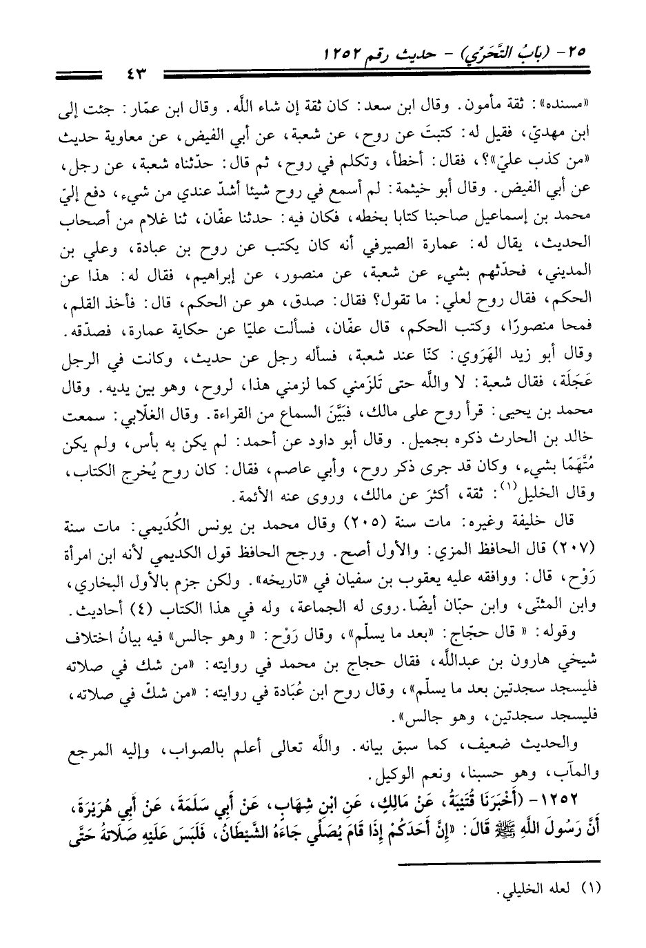 وقوله: "قال حجّاج: "بعد ما يسلّم"، وقال رَوْح: "وهو جالس" فيه بيانُ اختلاف شيخي هارون بن عبد الله، فقال حجاج بن محمد في روايته: "من شك في صلاته فليسجد سجدتين بعد ما يسلّم"، وقال روح ابن عُبَادة في روايته: "من شك في صلاته، فليسجد سجدتين، وهو جالس".