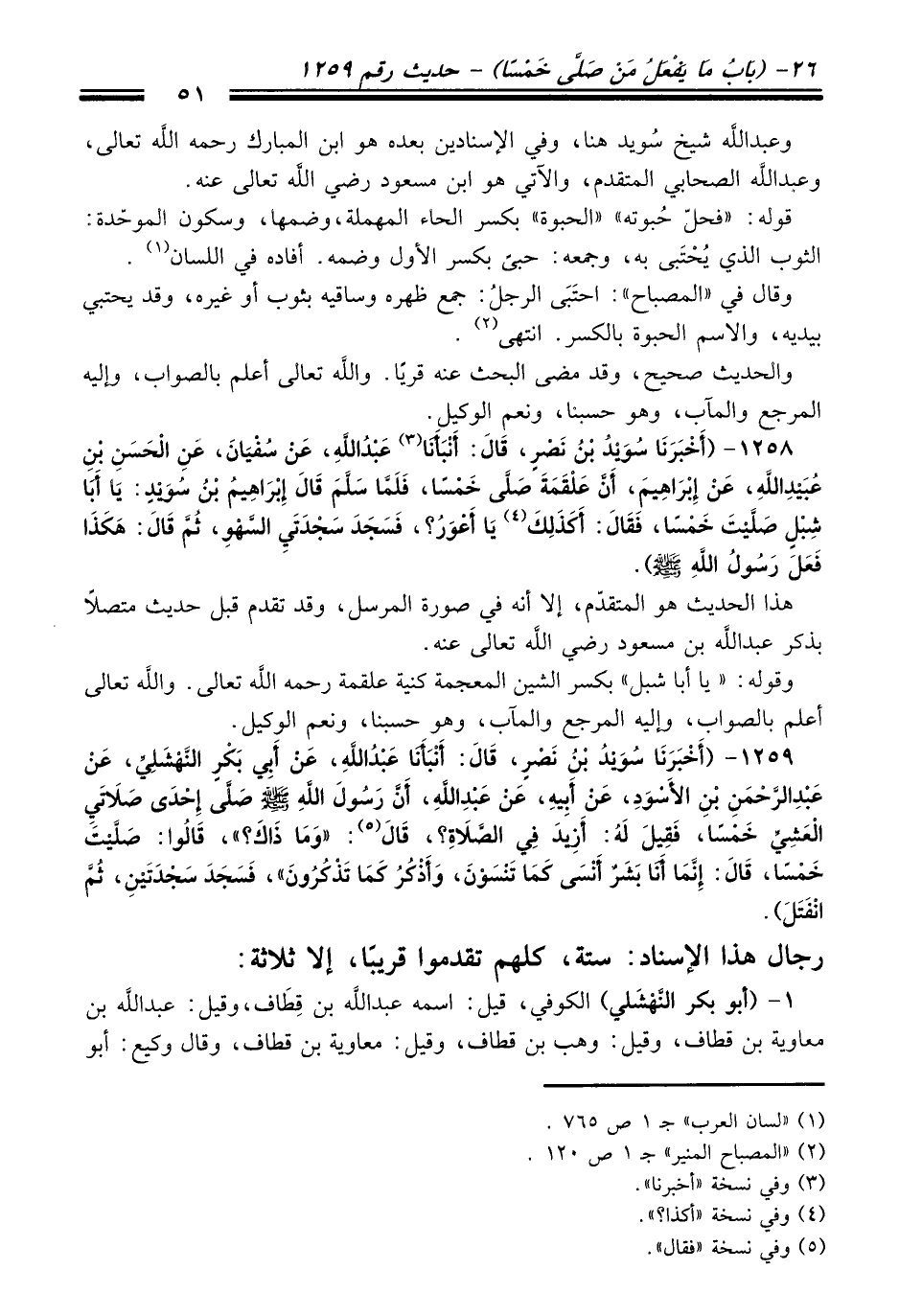 1258 - (أَخْبَرَنَا سُوَيْدُ بْنُ نَصْرٍ، قَالَ: أَنْبَأَنَا (¬3) عَبْدُ اللَّهِ، عَنْ سُفْيَانَ، عَنِ الْحَسَنِ بْنِ عُبَيْدِ اللَّهِ، عَنْ إِبْرَاهِيمَ، أَنَّ عَلْقَمَةَ صَلَّى خَمْسًا، فَلَمَّا سَلَّمَ قَالَ إِبْرَاهِيمُ بْنُ سُوَيْدٍ: يَا أَبَا شِبْلٍ صَلَّيْتَ خَمْسًا، فَقَالَ: أَكَذَلِكَ (¬4) يَا أَعْوَرُ؟ فَسَجَدَ سَجْدَتَي السَّهْوِ، ثُمَّ قَالَ: هَكَذَا فَعَلَ رَسُولُ اللَّهِ -صلى الله عليه وسلم-).