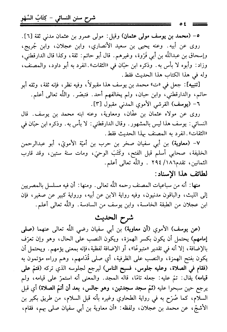 (عن يوسف) الأموي (أن معاوية) بن أبي سفيان رضي الله تعالى عنهما (صلى إمامهم) يحتمل أن يكون بكسر الهمزة، ويكون النصب على الحال، وهو وإن تعرّف بالإضافة، إلا أنه في تقدير "متبوعاً"، أو الإضافة لفظية، فإنه بمعنى يؤمهم. ويحتمل أن يكون بفتح الهمزة، والنصب على الظرفية، أي صلى قُدّامهم، وهم وراءه مؤتمون به (فقام في الصلاة، وعليه جلوس، فسبح الناس) ليرجع لجلوسه الذي تركه (فتمّ على قيامه) يقال: تمّ عليه: جعله تاماً، قاله المجد. والمعنى أنه استمرّ على قيامه، ولم يرجع حين سبحوا عليه (ثمّ سجد سجدتين، وهو جالس، بعد أن أتمّ الصلاة) أي قبل السلام، كما صُرّح به في رواية الطحاوي وغيره بأنه قبل السلام، من طريق بكير بن الأشجّ، عن محمد بن عجلان، ولفظه: "أن معاوية بن أبي سفيان صلى بهم، فقام،