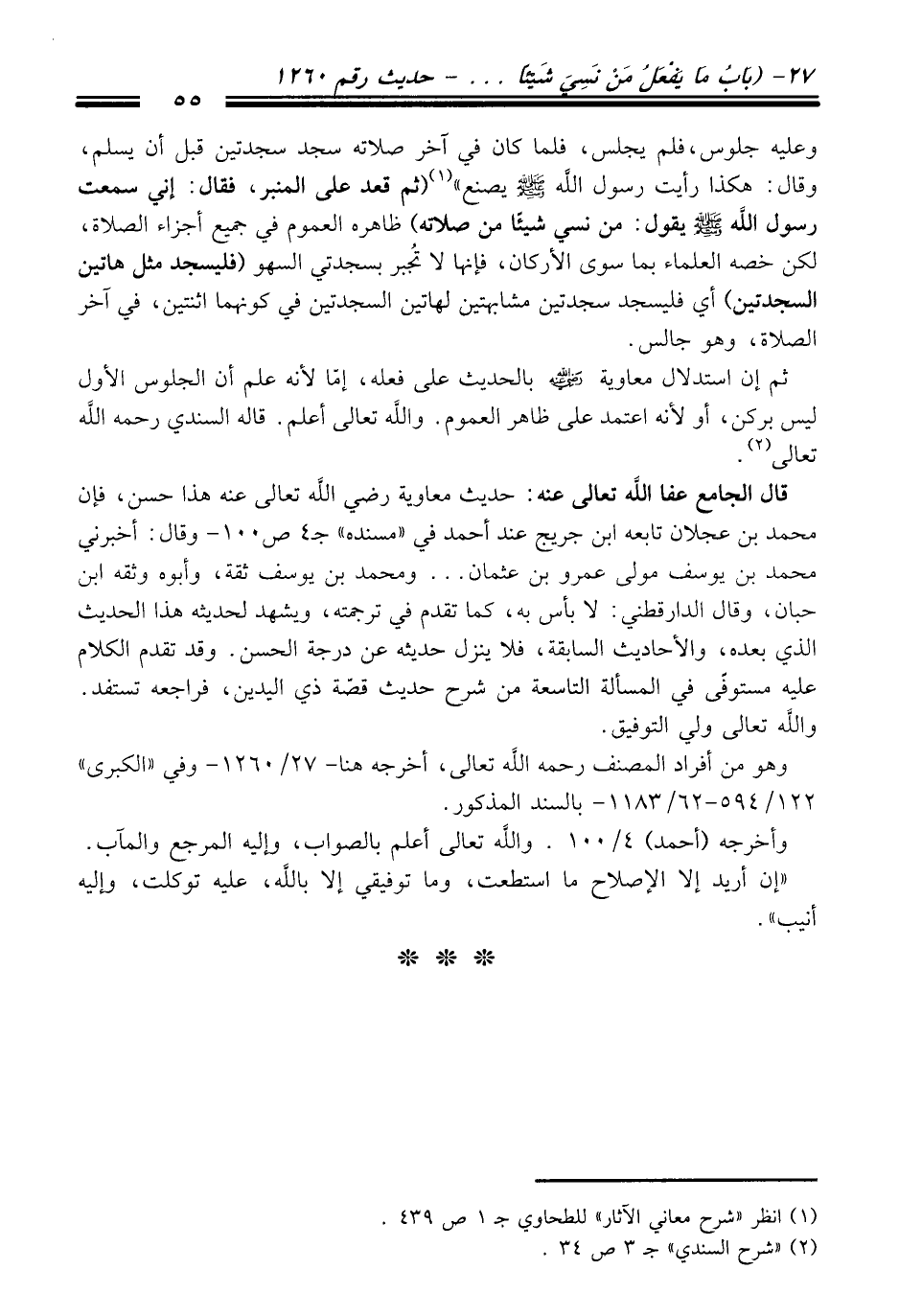 قال الجامع عفا الله تعالى عنه: حديث معاوية رضي الله تعالى عنه هذا حسن، فإن محمد بن عجلان تابعه ابن جريج عند أحمد في "مسنده" جـ 4 ص 100 - وقال: أخبرني محمد بن يوسف مولى عمرو بن عثمان ... ومحمد بن يوسف ثقة، وأبوه وثقه ابن حبان، وقال الدارقطني. لا بأس به، كما تقدم في ترجمته، ويشهد لحديثه هذا الحديث الذي بعده، والأحاديث السابقة، فلا ينزل حديثه عن درجة الحسن. وقد تقدم الكلام عليه مستوفًى في المسألة التاسعة من شرح حديث قصّة ذي اليدين، فراجعه تستفد. والله تعالى ولي التوفيق.