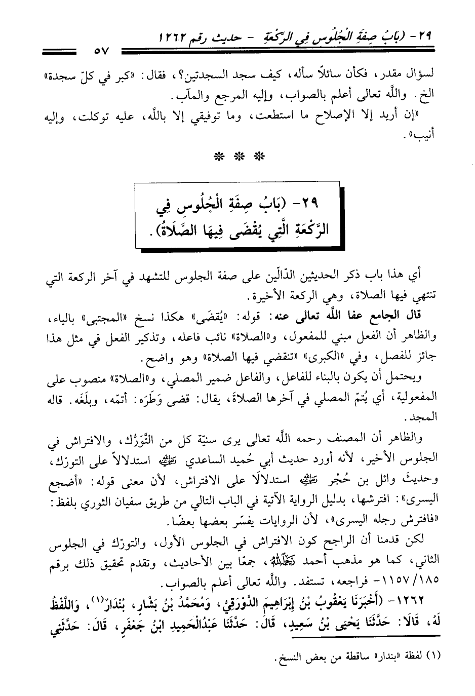 والظاهر أن المصنف رحمه الله تعالى يرى سنيّة كل من التَّوَرُّك، والافتراش في الجلوس الأخير، لأنه أورد حديث أبي حُميد الساعدي -رضي الله عنه- استدلالاً على التورّك، وحديثَ وائل بن حُجْر -رضي الله عنه- استدلالاً على الافتراش، لأن معنى قوله: "أضجع اليسرى": افترشها، بدليل الرواية الآتية في الباب التالي من طريق سفيان الثوري بلفظ: "فافترش رجله اليسرى"، لأن الروايات يفسر بعضها بعضاً.