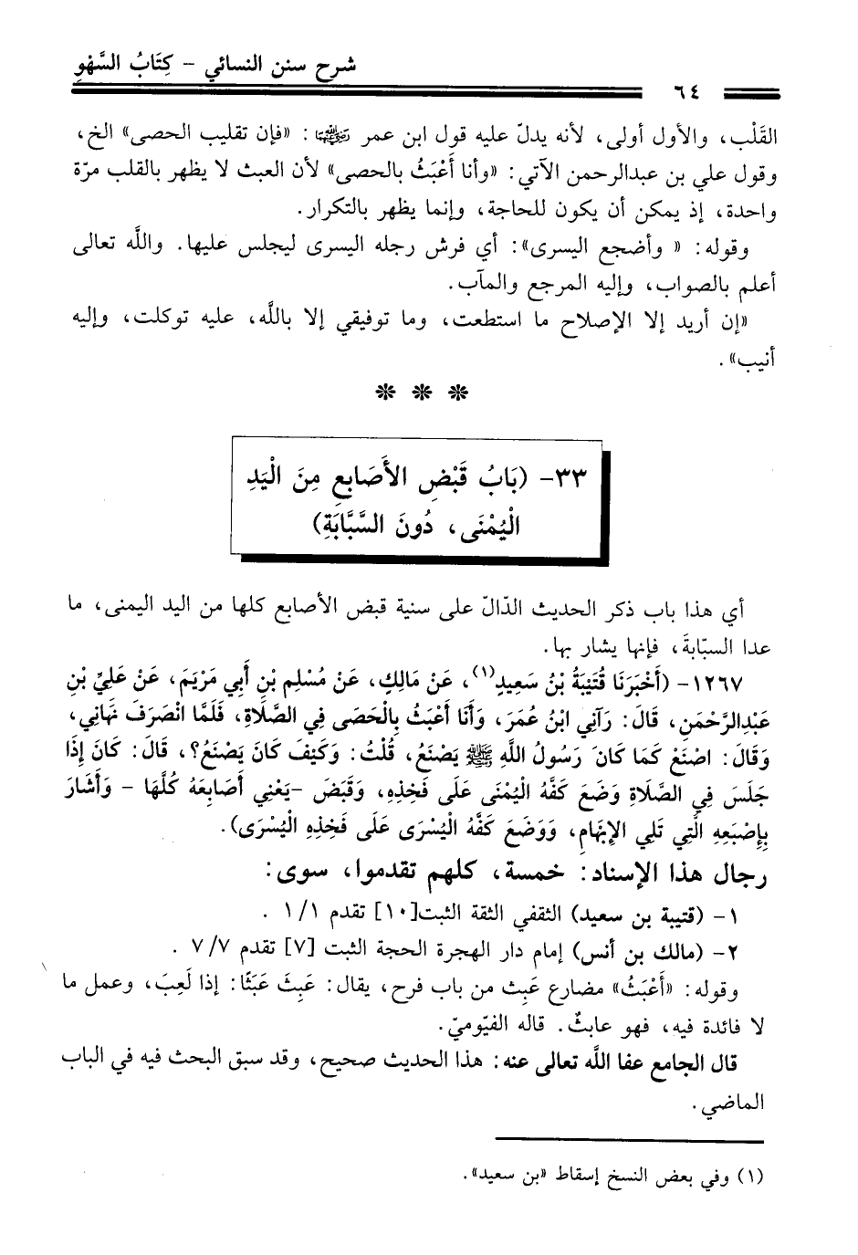 1267 - (أَخْبَرَنَا قُتَيْبَةُ بْنُ سَعِيدٍ (¬1)، عَنْ مَالِكٍ، عَنْ مُسْلِمِ بْنِ أَبِي مَرْيَمَ، عَنْ عَلِيِّ بْنِ عَبْدِ الرَّحْمَنِ، قَالَ: رَآنِي ابْنُ عُمَرَ، وَأَنَا أَعْبَثُ بِالْحَصَى فِي الصَّلاَةِ، فَلَمَّا انْصَرَفَ نَهَانِي، وَقَالَ: اصْنَعْ كَمَا كَانَ رَسُولُ اللَّهِ -صلى الله عليه وسلم- يَصْنَعُ، قُلْتُ: وَكَيْفَ كَانَ يَصْنَعُ؟ قَالَ: كَانَ إِذَا جَلَسَ فِي الصَّلاَةِ وَضَعَ كَفَّهُ الْيُمْنَى عَلَى فَخِذِهِ، وَقَبَضَ -يَعْنِي أَصَابِعَهُ كُلَّهَا- وَأَشَارَ بِأُصْبُعِهِ الَّتِي تَلِي الإِبْهَامَ، وَوَضَعَ كَفَّهُ الْيُسْرَى عَلَى فَخِذِهِ الْيُسْرَى).