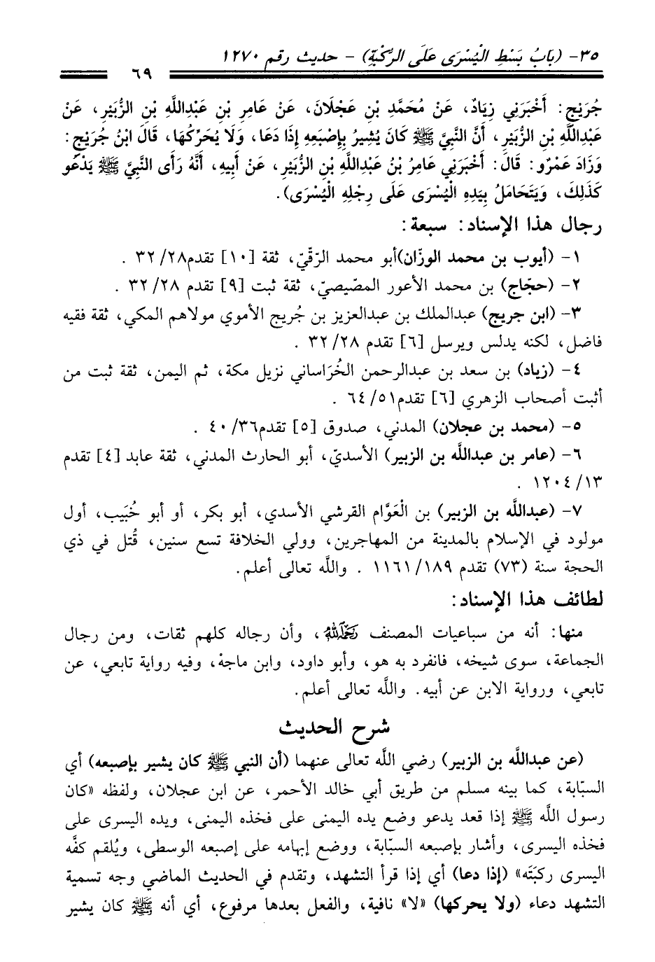 جُرَيْجٍ: أَخْبَرَنِي زِيَادٌ، عَنْ مُحَمَّدِ بْنِ عَجْلاَنَ، عَنْ عَامِرِ بْنِ عَبْدِ اللَّهِ بْنِ الزُّبَيْرِ، عَنْ عَبْدِ اللَّهِ بْنِ الزُّبَيْرِ، أَنَّ النَّبِيَّ -صلى الله عليه وسلم- كَانَ يُشِيرُ بِأُصْبُعِهِ إِذَا دَعَا، وَلاَ يُحَرِّكُهَا، قَالَ ابْنُ جُرَيْجٍ: وَزَادَ عَمْرٌو: قَالَ: أَخْبَرَنِي عَامِرُ بْنُ عَبْدِ اللَّهِ بْنِ الزُّبَيْرِ، عَنْ أَبِيهِ، أَنَّهُ رَأَى النَّبِيَّ -صلى الله عليه وسلم- يَدْعُو كَذَلِكَ، وَيَتَحَامَلُ بِيَدِهِ الْيُسْرَى عَلَى رِجْلِهِ الْيُسْرَى).