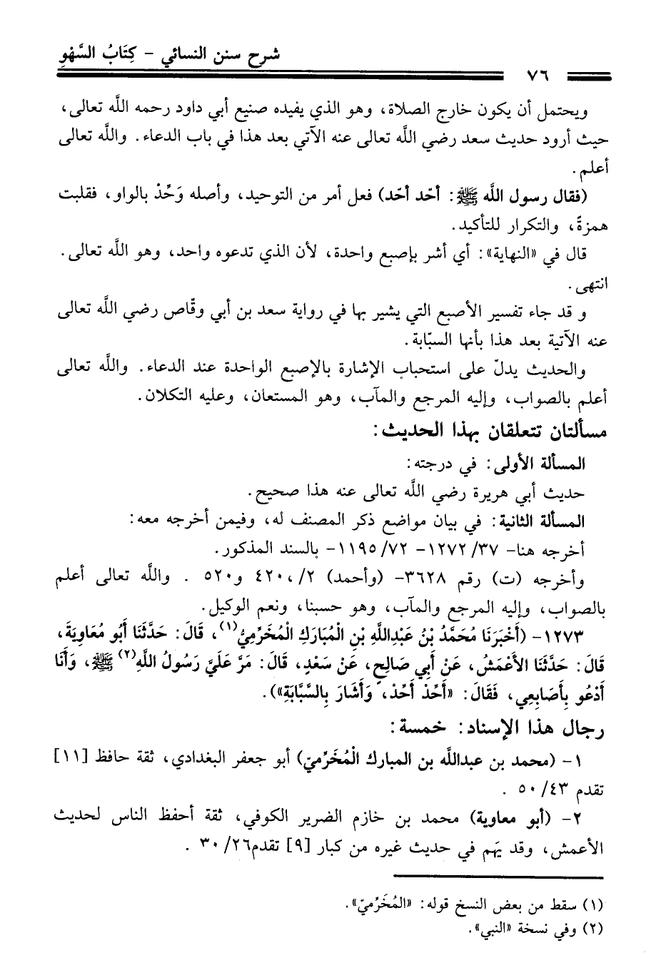 1273 - (أَخْبَرَنَا مُحَمَّدُ بْنُ عَبْدِ اللَّهِ بْنِ الْمُبَارَكِ الْمُخَرِّمِيُّ (¬1)، قَالَ: حَدَّثَنَا أَبُو مُعَاوِيَةَ، قَالَ: حَدَّثَنَا الأَعْمَشُ، عَنْ أَبِي صَالِحٍ، عَنْ سَعْدٍ، قَالَ: مَرَّ عَلَيَّ رَسُولُ اللَّهِ (¬2) -صلى الله عليه وسلم- وَأَنَا أَدْعُو بِأَصَابِعِي، فَقَالَ: "أَحِّدْ أَحِّدْ، وَأَشَارَ بِالسَّبَّابَةِ").