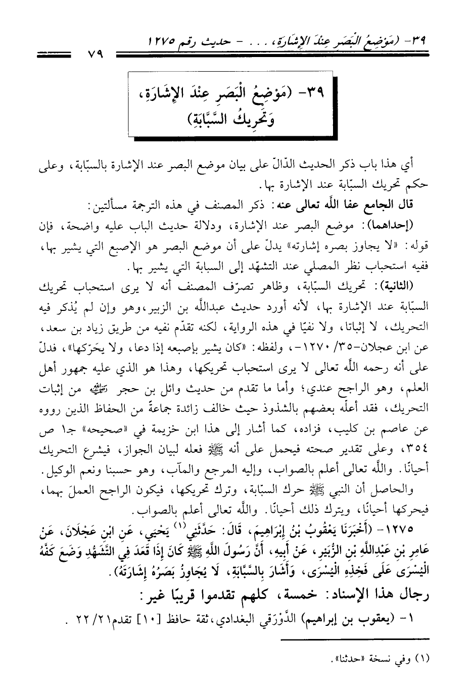 39 - (مَوْضِعُ الْبَصَرِ عِنْدَ الإِشَارَةِ، وَتحَرِيكُ السَّبَّابَةِ)