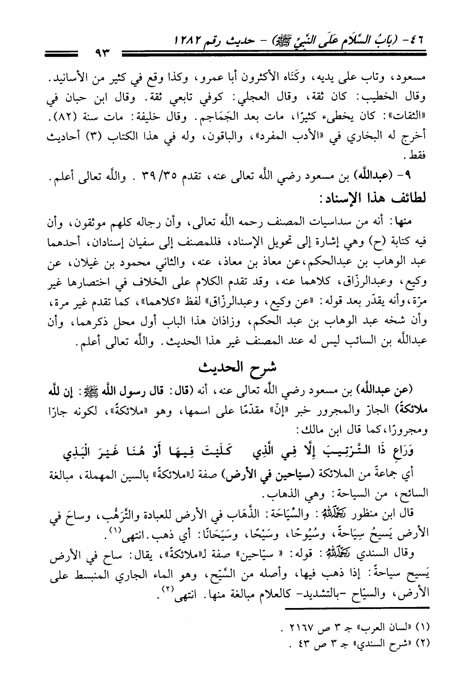 (عن عبد الله) بن مسعود رضي الله تعالى عنه، أنه (قال: قال رسول الله -صلى الله عليه وسلم-: أن لله ملائكةً) الجارّ والمجرور خبر "إنّ" مقدّماً على أسمها، وهو "ملائكةً"، لكونه جاراً ومجروراً، كما قال ابن مالك:
