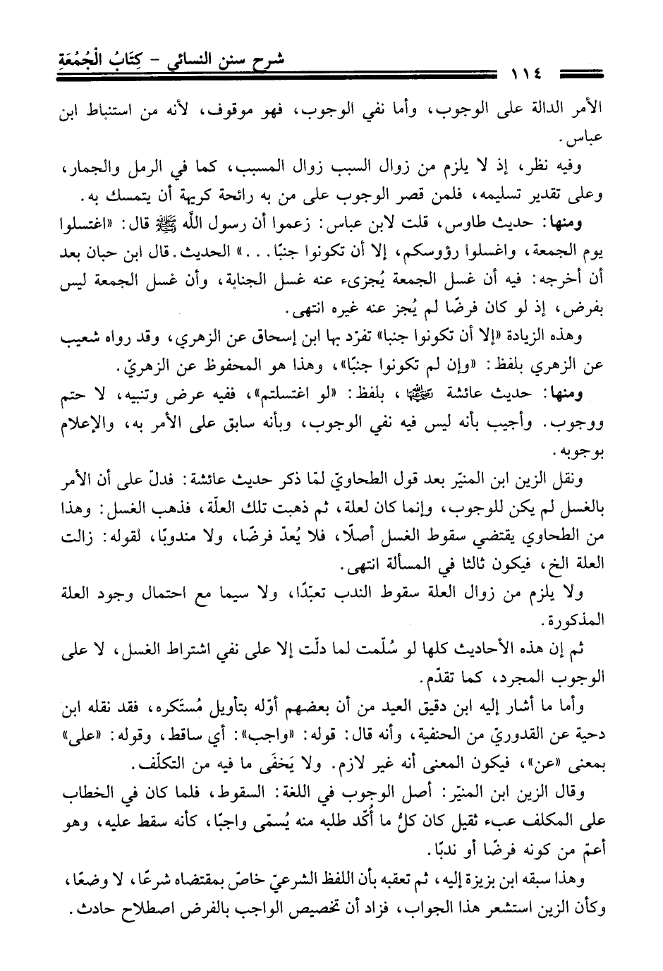 ونقل الزين ابن المنيّر بعد قول الطحاويّ لمّا ذكر حديث عائشة: فدلّ على أن الأمر بالغسل لم يكن للوجوب، وإنما كان لعلة، ثم ذهبت تلك العلّة، فذهب الغسل: وهذا من الطحاوي يقتضي سقوط الغسل أصلًا، فلا يُعدّ فرضًا، ولا مندوبًا، لقوله: زالت العلة الخ، فيكون ثالثا في المسألة انتهى.