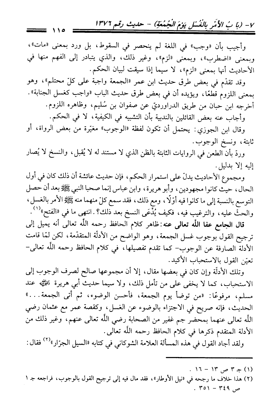 قال الجامع عفا الله تعالى عنه: ظاهر كلام الحافظ رحمه الله تعالى أنه يميل إلى ترجيح القول بوجوب غسل الجمعة، وهو الواضح من الأدلّة المتقدّمة، لكن لمّا قامت الأدلة الصارفة عن الوجوب -كما تقدم تفصيلها، في كلام الحافظ رحمه الله تعالى- تعين القول بالاستحباب الأكيد.