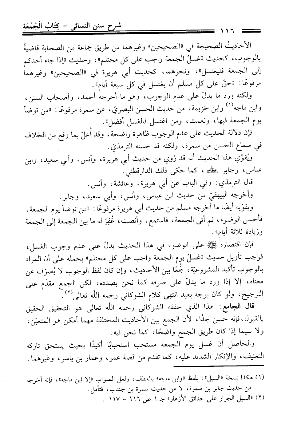 فإن اقتصاره -صلى الله عليه وسلم- على الوضوء في هذا الحديث يدلّ على عدم وجوب الغسل، فوجب تأويل حديث "غسلُ يوم الجمعة واجب على كل محتلم" بحمله على أن المراد بالوجوب تأكيد المشروعيّة، جَمعًا بين الأحاديث، وإن كان لفظ الوجوب لا يُصرَف عن معناه، إلا إذا ورد ما يدل على صرفه كما نحن بصدده، لكن الجمع مقدّم على الترجيح، ولو كان بوجه بعيد انتهى كلام الشوكاني رحمه الله تعالى (¬2).