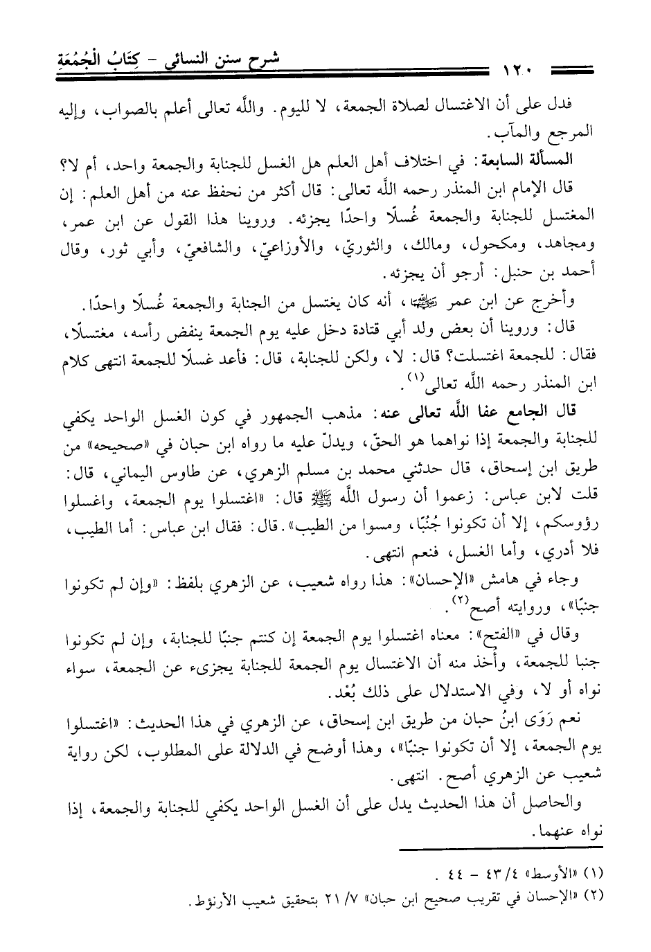 قال الجامع عفا الله تعالى عنه: مذهب الجمهور في كون الغسل الواحد يكفي للجنابة والجمعة إذا نواهما هو الحقّ، ويدلّ عليه ما رواه ابن حبان في "صحيحه" من طريق ابن إسحاق، قال حدثني محمد بن مسلم الزهري، عن طاوس اليماني، قال: قلت لابن عباس: زعموا أن رسول الله -صلى الله عليه وسلم- قال: "اغتسلوا يوم الجمعة، واغسلوا رؤوسكم، إلا أن تكونوا جُنُبًا، ومسوا من الطيب". قال: فقال ابن عباس: أما الطيب، فلا أدري، وأما الغسل، فنعم انتهى.