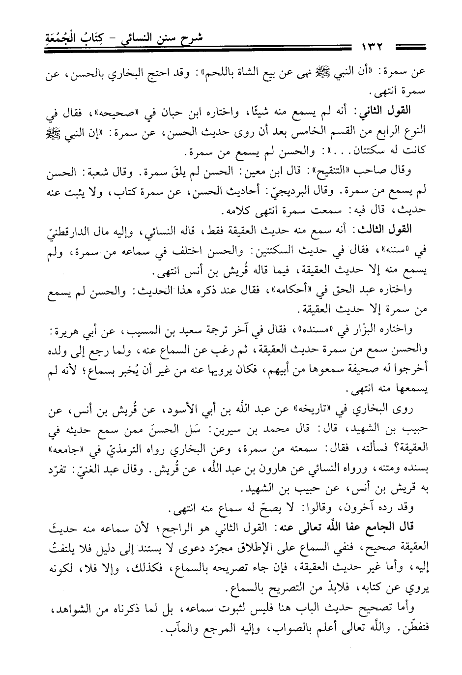 وقال صاحب "التنقيح": قال ابن معين: الحسن لم يلقَ سمرة. وقال شعبة: الحسن لم يسمع من سمرة. وقال البرديجيّ: أحاديث الحسن، عن سمرة كتاب، ولا يثبت عنه حديث، قال فيه: سمعت سمرة انتهى كلامه.