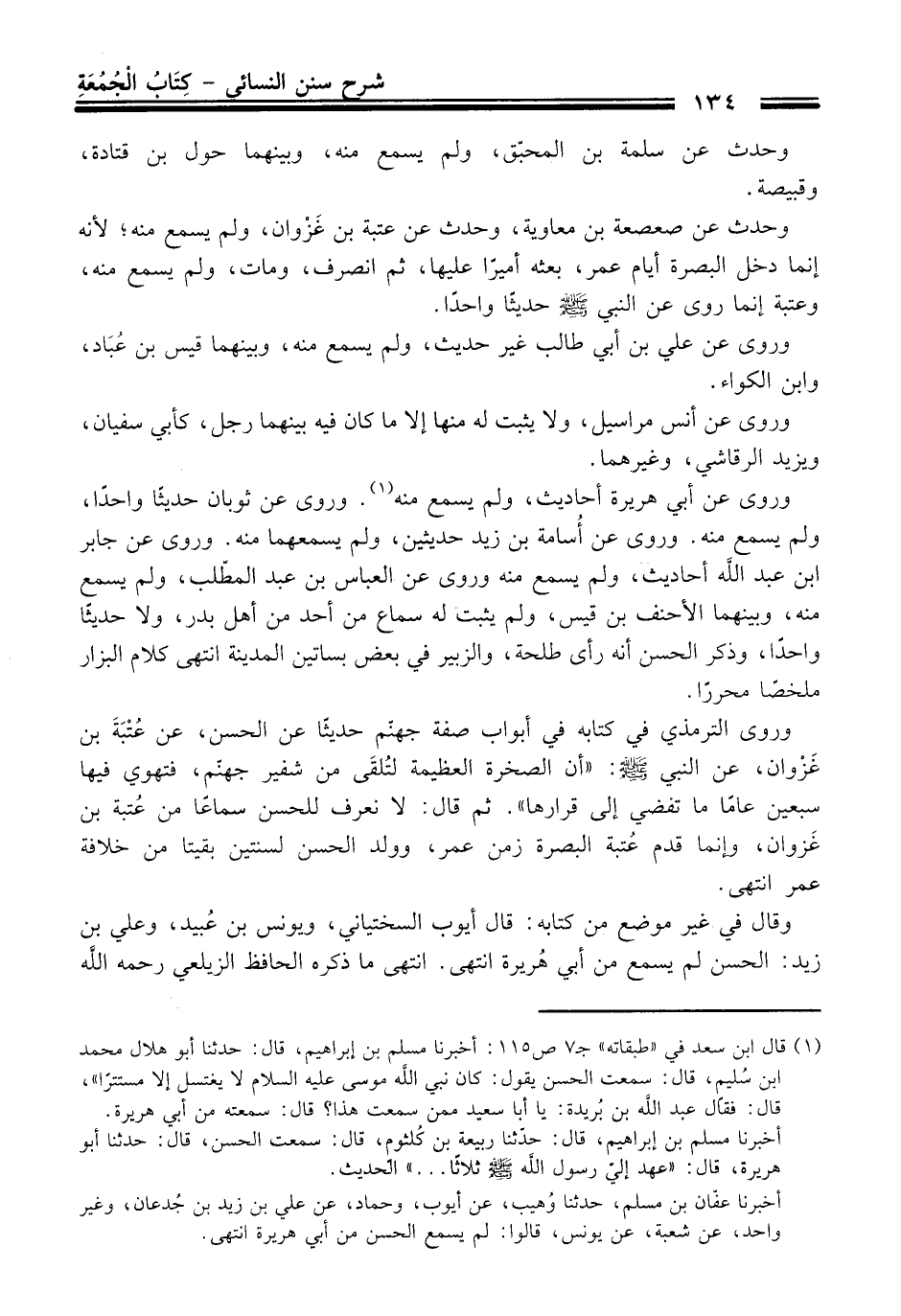 وروى الترمذي في كتابه في أبواب صفة جهنّم حديثًا عن الحسن، عن عُتْبَةَ بن غَزْوان، عن النبي -صلى الله عليه وسلم-: "أن الصخرة العظيمة لتُلقَى من شفير جهنّم، فتهوي فيها سبعين عامًا ما تفضي إلى قرارها". ثم قال: لا نعرف للحسن سماعًا من عُتبة بن غَزوان، وإنما قدم عُتبة البصرة زمن عمر، وولد الحسن لسنتين لقيتا من خلافة عمر انتهى.