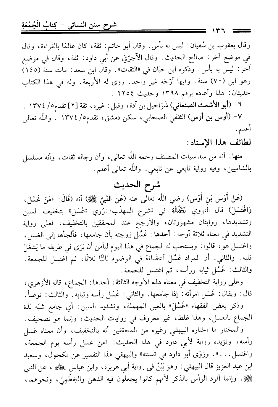 (عَنْ أَوْس بْنِ أَوْس) رضي الله تعالى عنه (عَنِ النَّبِيِّ -صلى الله عليه وسلم-) أنه (قَالَ: "مَنْ غَسَّلَ، وَاغْتَسَلَ) قال النووي رحمه الله في "شَرح المهذّب": رُوي "غَسَل" بتخفيف السين وتشديدها، روايتان مشهورتان، والأرجح عند المحققين بالتخفيف، فعلى رواية التشديد في معناه ثلاثة أوجه: أحدهما: غَسَّل زوجته بأن جامعها، فألجأها إلى الغسل، واغتسل هو، قالوا: ويستحب له الجماع في هذا اليوم ليأمن أن يَرَى في طريقه ما يَشغَلُ قلبه. والثاني: أن المراد غَسَّلَ أعضَاءَهُ في الوضوء ثالثًا ثلاثًا، ثم اغتسل للجمعة. والثالث: غَسَّل ثيابه ورأسه، ثم اغتسل للجمعة.