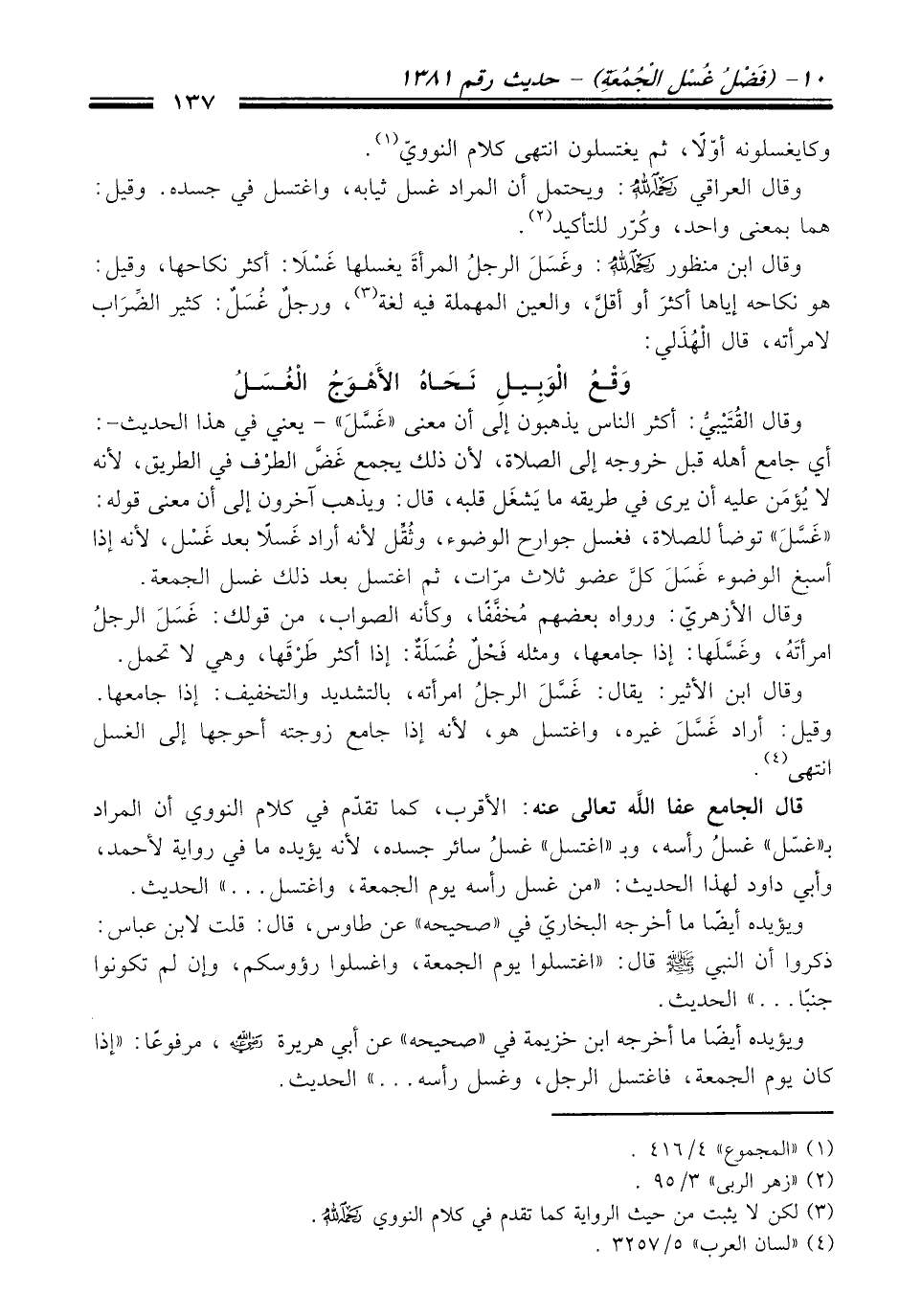 وقال القُتَيْبيُّ: أكثر الناس يذهبون إلى أن معنى "غَسَّلَ" -يعني في هذا الحديث-: أي جامع أهله قبل خروجه إلى الصلاة، لأن ذلك يجمع غَضَّ الطرْف في الطريق؛ لأنه لا يُؤمَن عليه أن يرى في طريقه ما يَشغَل قلبه، قال. ويذهب آخرون إلى أن معنى قوله: "غَسَّلَ" توضأ للصلاة، فغسل جوارح الوضوء، وثُقِّل لأنه أراد غَسلًا بعد غَسْل؛ لأنه إذا أسبغ الوضوء غَسَلَ كلَّ عضو ثلاث مرّات، ثم اغتسل بعد ذلك غسل الجُمُعة.