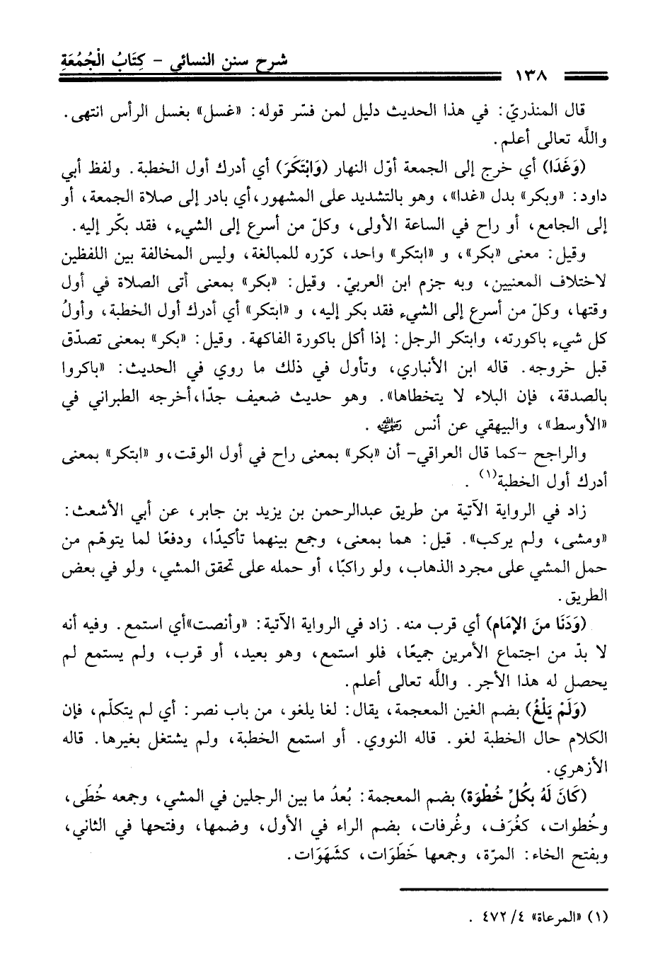 والراجح -كما قال العراقي- أن "بكر" بمعنى راح في أول الوقت، و"ابتكر" بمعنى أدرك أول الخطبة (¬1).
