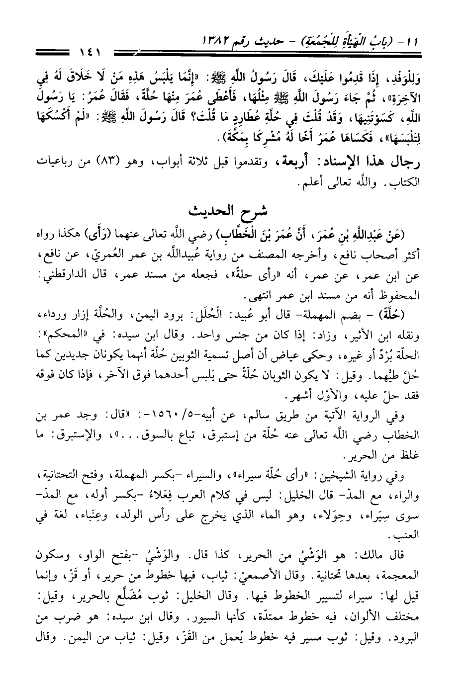 (عَنْ عَبْدِاللهِ بْنِ عُمَرَ، أَنَّ عُمَرَ بْنَ الْخَطَّاب) رضي الله تعالى عنهما (رَأَى) هكذا رواه أكثر أصحاب نافع، وأخرجه المصنف من رواية عُبيد الله بن عمر العُمريّ، عن نافع، عن ابن عمر، عن عمر، أنه "رأى حلة" فجعله من مسند عمر، قال الدارقطني: المحفوظ أنه من مسند ابن عمر انتهى.