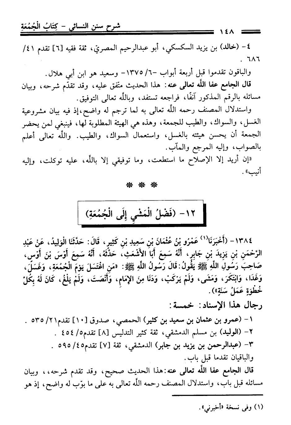1384 - (أَخْبَرَنَا (¬1) عَمْرُو بْنُ عُثْمَانَ بْنِ سَعِيدِ بْنِ كَثِيرٍ، قَالَ: حَدَّثَنَا الْوَلِيدُ، عَنْ عَبْدِ الرَّحْمَنِ بْنِ يَزِيدَ بْنِ جَابِرٍ، أَنَّهُ سَمِعَ أَبَا الأَشْعَثِ، حَدَّثَهُ، أَنَّهُ سَمِعَ أَوْسَ بْنَ أَوْسٍ، صَاحِبَ رَسُولِ اللَّهِ -صلى الله عليه وسلم- يَقُولُ: قَالَ رَسُولُ اللَّهِ -صلى الله عليه وسلم-: "مَنِ اغْتَسَلَ يَوْمَ الْجُمُعَةِ، وَغَسَّلَ، وَغَدَا، وَابْتَكَرَ، وَمَشَى، وَلَمْ يَرْكَبْ، وَدَنَا مِنَ الإِمَامِ، وَأَنْصَتَ، وَلَمْ يَلْغُ، كَانَ لَهُ بِكُلِّ خُطْوَةٍ عَمَلُ سَنَةٍ").