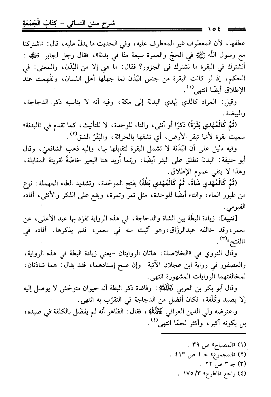 (ثُمَّ كَالْمُهْدي شَاةً، ثُمَّ كَالْمُهْدي بَطَّةً) بفتح الموحدة، وتشديد الطاء المهملة: نوع من طيور الماء، والتاء أيضًا للوحدة، مثل تمر وتمرة، ويقع على الذكر والأنثى، أفاده الفيومي.