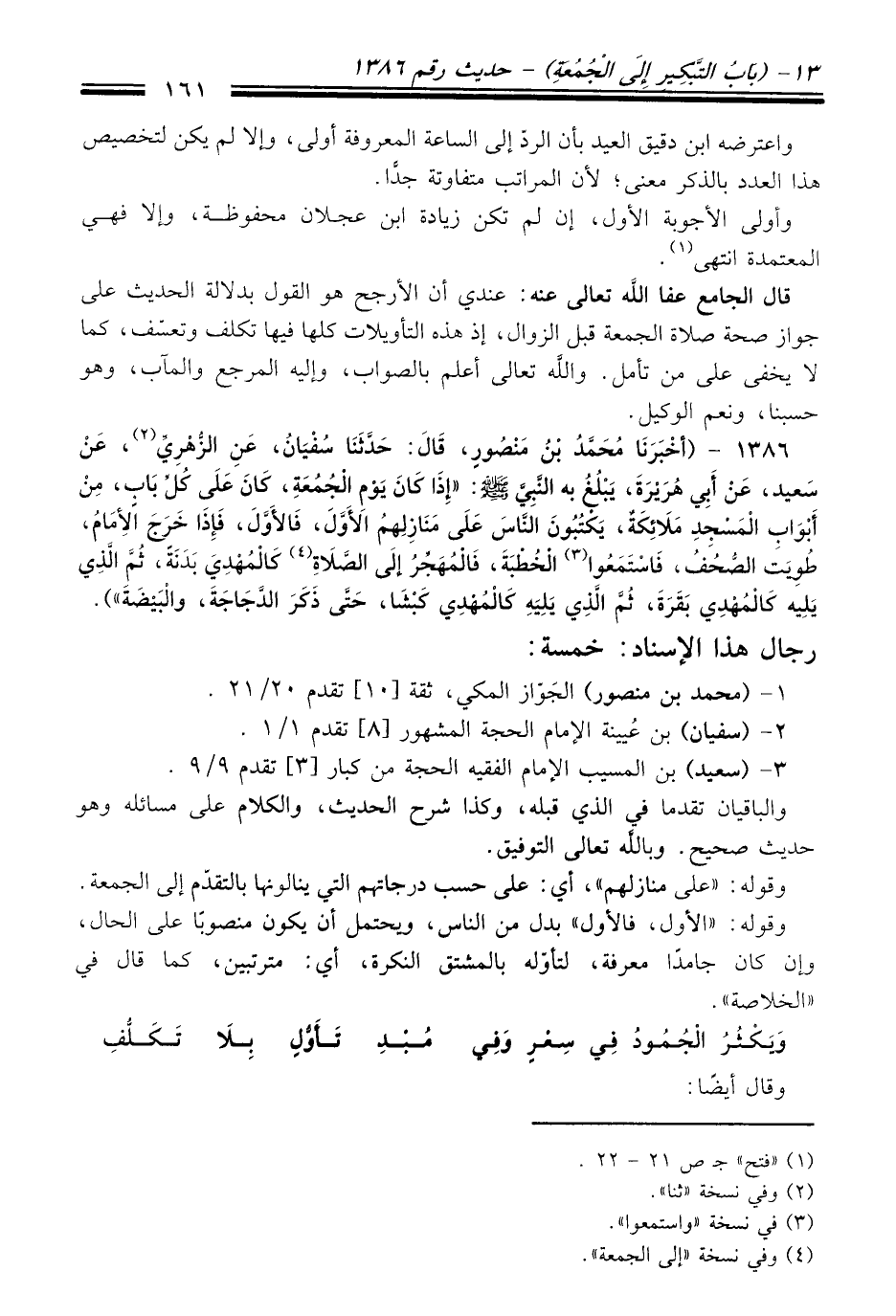 1386 - (أَخْبَرَنَا مُحَمَّدُ بْنُ مَنْصُورٍ، قَالَ: حَدَّثَنَا سُفْيَانُ، حَدَّثَنَا الزُّهْرِيُّ (¬2)، عَنْ سَعِيدٍ، عَنْ أَبِي هُرَيْرَةَ، يَبْلُغُ بِهِ النَّبِيَّ -صلى الله عليه وسلم-: "إِذَا كَانَ يَوْمُ الْجُمُعَةِ، كَانَ عَلَى كُلِّ بَابٍ، مِنْ أَبْوَابِ الْمَسْجِدِ مَلاَئِكَةٌ، يَكْتُبُونَ النَّاسَ عَلَى مَنَازِلِهِمُ الأَوَّلَ، فَالأَوَّلَ، فَإِذَا خَرَجَ الإِمَامُ، طُوِيَتِ الصُّحُفُ، وَاسْتَمَعُوا (¬3) الْخُطْبَةَ فَالْمُهَجِّرُ إِلَى الصَّلاَةِ (¬4) كَالْمُهْدِي بَدَنَةً، ثُمَّ الَّذِي يَلِيهِ كَالْمُهْدِي بَقَرَةً، ثُمَّ الَّذِي يَلِيهِ كَالْمُهْدِي كَبْشًا، حَتَّى ذَكَرَ الدَّجَاجَةَ، وَالْبَيْضَةَ").
