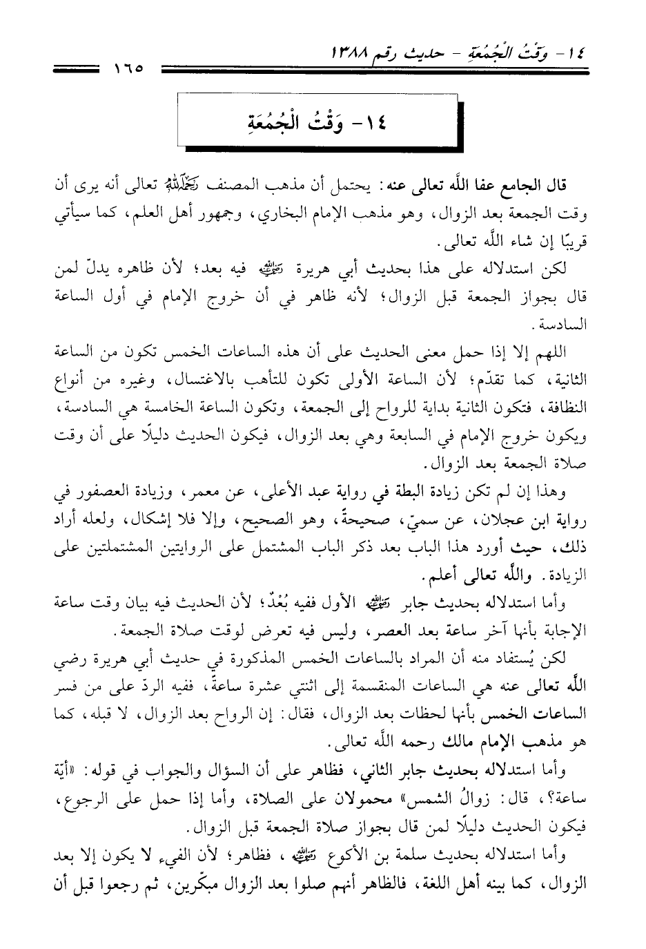 وأما استدلاله بحديث جابر الثاني، فظاهر على أن السؤال والجواب في قوله: "أيّة ساعة؟، قال: زوالُ الشمس" محمولان على الصلاة، وأما إذا حمل على الرجوع، فيكون الحديث دليلًا لمن قال بجواز صلاة الجمعة قبل الزوال.