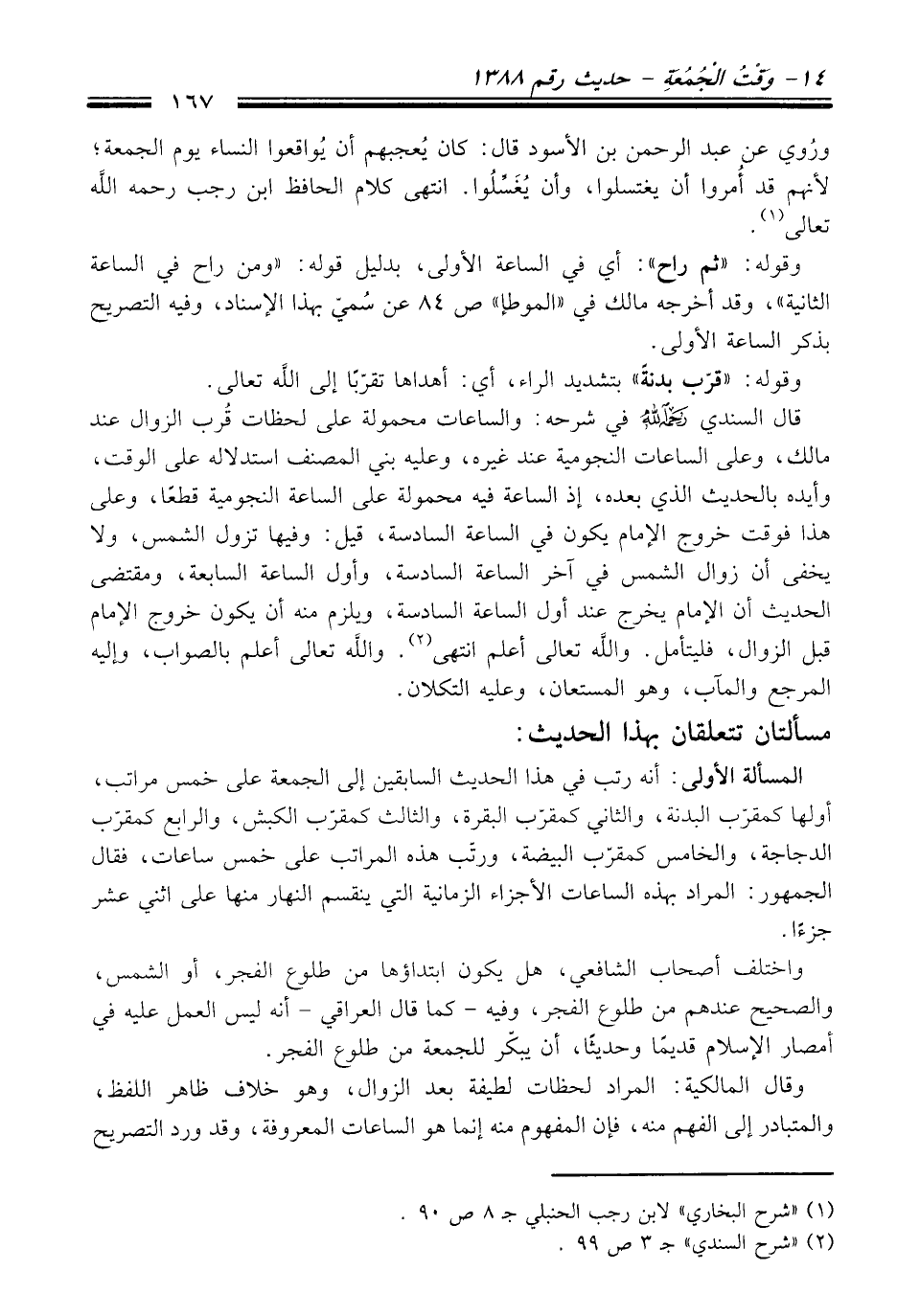 قال السندي رحمه الله في شرحه: والساعات محمولة على لحظات قُرب الزوال عند مالك، وعلى الساعات النجومية عند غيره، وعليه بني المصنف استدلاله على الوقت، وأيده بالحديث الذي بعده، إذ الساعة فيه محمولة على الساعة النجومية قطعًا، وعلى هذا فوقت خروج الإِمام يكون في الساعة السادسة، قيل: وفيها تزول الشمس، ولا يخفى أن زوال الشمس في آخر الساعة السادسة، وأول الساعة السابعة، ومقتضى الحديث أن الإِمام يخرج عند أول الساعة السادسة، ويلزم منه أن يكون خروج الإِمام قبل الزوال، فليتأمل. والله تعالى أعلم انتهى (¬2). والله تعالى أعلم بالصواب، وإليه المرجع والمآب، وهو المستعان، وعليه التكلان.