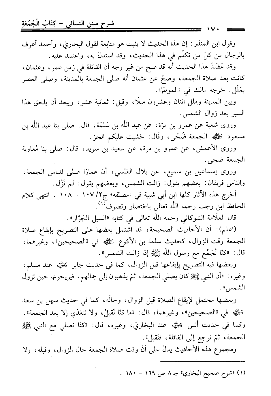 (اعلم): أن الأحاديث الصحيحة، قد اشتمل بعضها على التصريح بإيقاع صلاة الجمعة وقت الزوال، كحديث سلمة بن الأكوع -رضي الله عنه- في "الصحيحين"، وغيرهما، قال: "كنّا نُجَمِّع مع رسول الله -صلى الله عليه وسلم- إذا زالت الشمس".