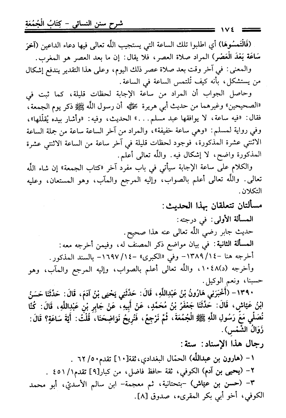 1390 - (أَخْبَرَنِي هَارُونُ بْنُ عَبْدِ اللَّهِ، قَالَ: حَدَّثَنِي يَحْيَى بْنُ آدَمَ، قَالَ: حَدَّثَنَا حَسَنُ بْنُ عَيَّاشٍ، قَالَ: حَدَّثَنَا جَعْفَرُ بْنُ مُحَمَّدٍ، عَنْ أَبِيهِ، عَنْ جَابِرِ بْنِ عَبْدِ اللَّهِ، قَالَ: كُنَّا نُصَلِّي مَعَ رَسُولِ اللَّهِ -صلى الله عليه وسلم- الْجُمُعَةَ، ثُمَّ نَرْجِعُ، فَنُرِيحُ نَوَاضِحَنَا، قُلْتُ: أَيَّةَ سَاعَةٍ؟ قَالَ: زَوَالُ الشَّمْسِ).