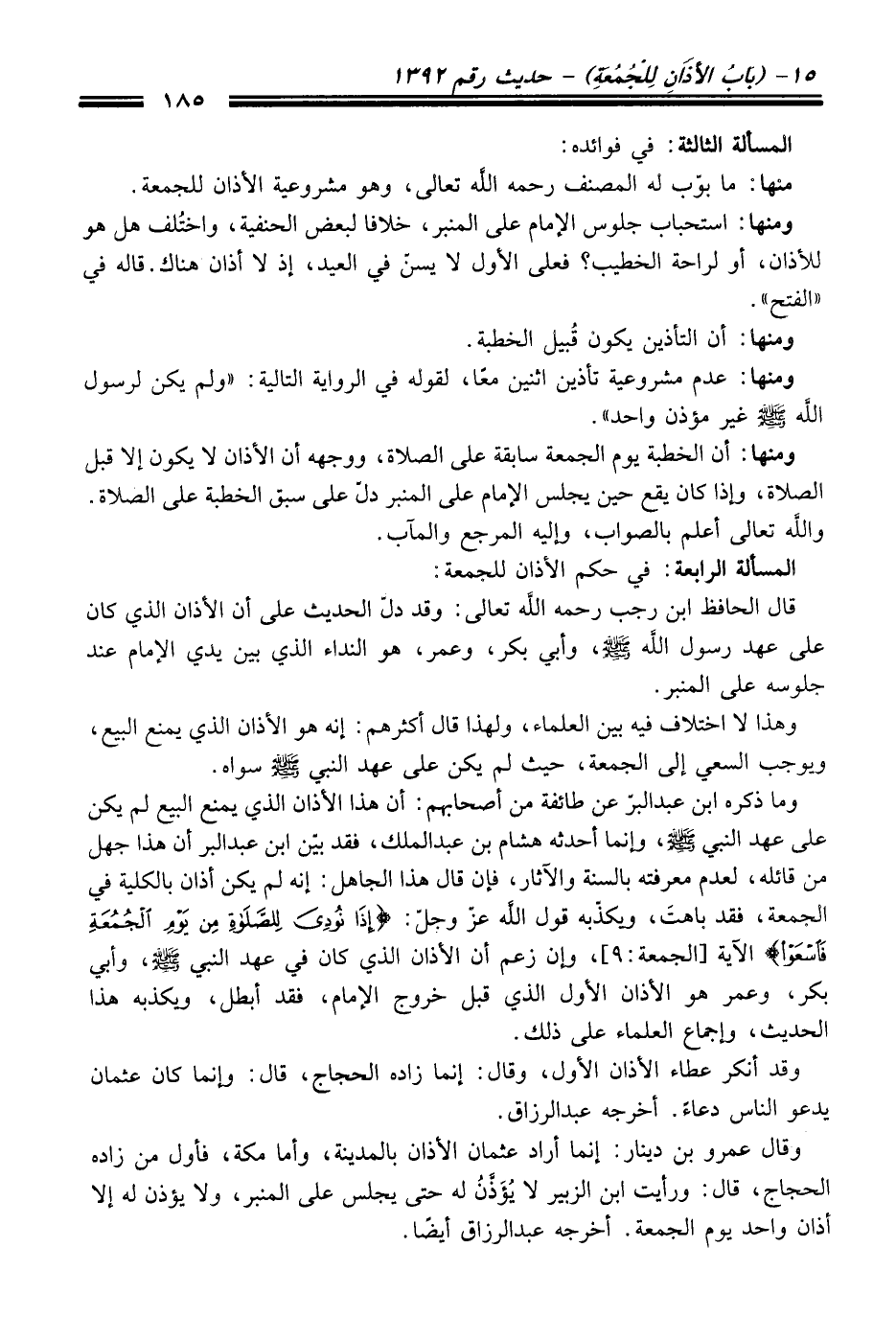 وما ذكره ابن عبد البرّ عن طائفة من أصحابهم: أن هذا الأذان الذي يمنع البيع لم يكن على عهد النبي -صلى الله عليه وسلم-، وإنما أحدثه هشام بن عبد الملك، فقد بيّن ابن عبد البر أن هذا جهل من قائله، لعدم معرفته بالسنة والآثار، فإن قال هذا الجاهل: إنه لم يكن أذان بالكلية في الجمعة، فقد باهتَ، ويكذّبه قول الله عز وجل: {إِذَا نُودِيَ لِلصَّلَاةِ مِنْ يَوْمِ الْجُمُعَةِ فَاسْعَوْا} [الجمعة: 9]، وإن زعم أن الأذان الذي كان في عهد النبي -صلى الله عليه وسلم-، وأبي بكر، وعمر هو الأذان الأول الذي قبل خروج الإِمام، فقد أبطل، ويكذبه هذا الحديث، وإجماع العلماء على ذلك.