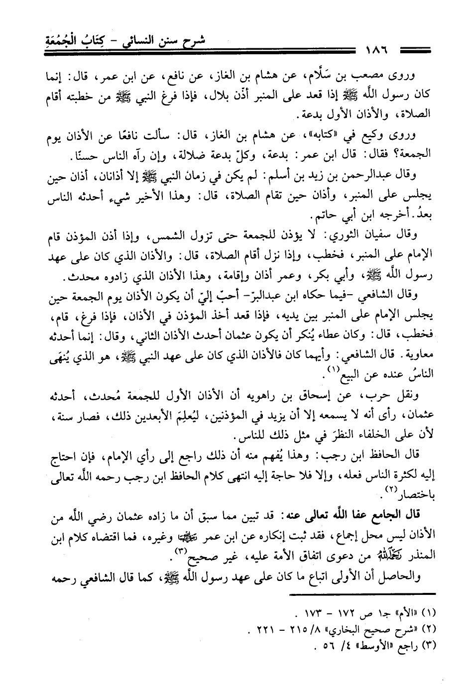قال الجامع عفا الله تعالى عنه: قد تبين مما سبق أن ما زاده عثمان رضي الله من الأذان ليس محل إجماع، فقد ثبت إنكاره عن ابن عمر -رضي الله عنهما- وغيره، فما اقتضاه كلام ابن المنذر رحمه الله من دعوى اتفاق الأمة عليه، غير صحيح (¬3).