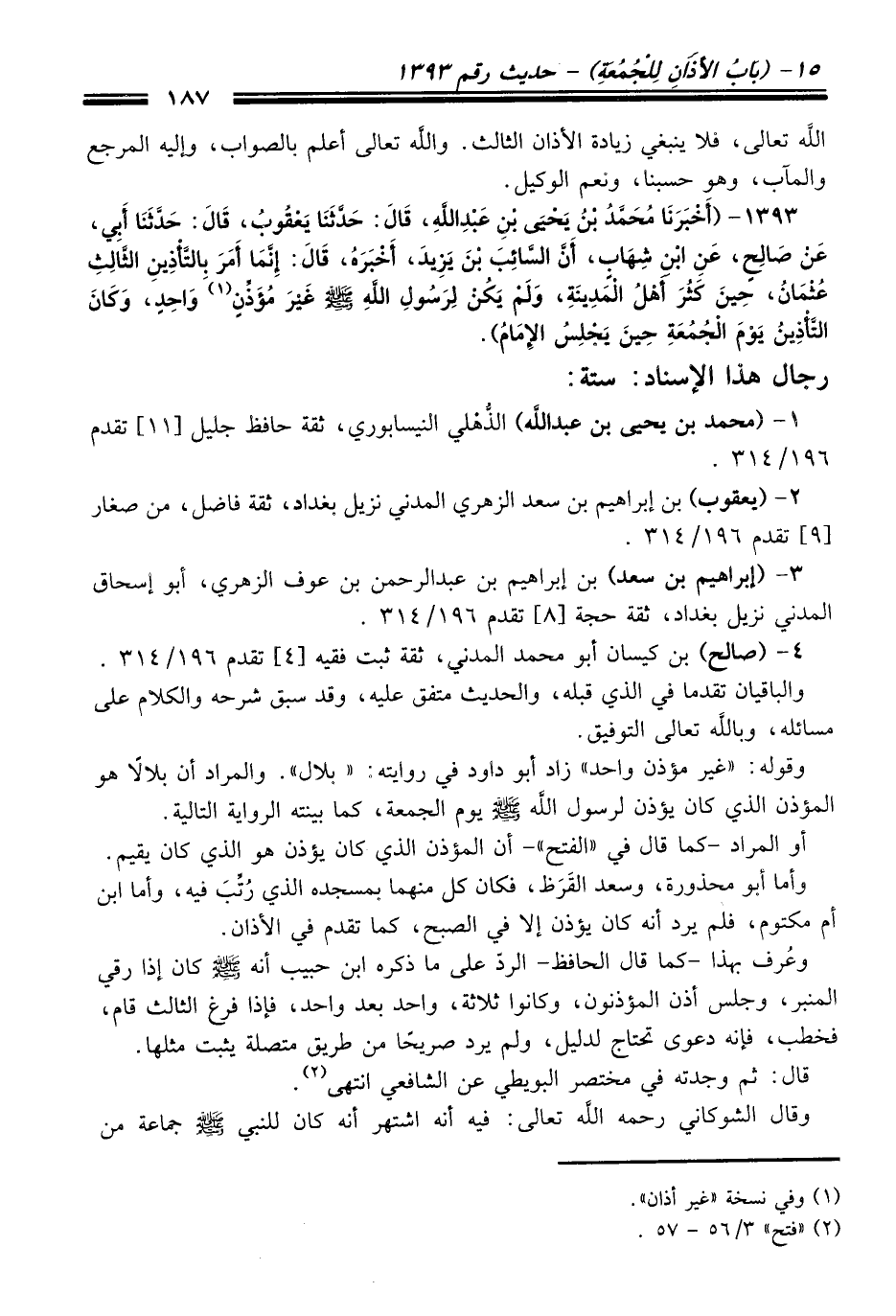 1393 - (أَخْبَرَنَا مُحَمَّدُ بْنُ يَحْيَى بْنِ عَبْدِ اللَّهِ، قَالَ: حَدَّثَنَا يَعْقُوبُ، قَالَ: حَدَّثَنَا أَبِي، عَنْ صَالِحٍ، عَنِ ابْنِ شِهَابٍ، أَنَّ السَّائِبَ بْنَ يَزِيدَ، أَخْبَرَهُ، قَالَ: إِنَّمَا أَمَرَ بِالتَّأْذِينِ الثَّالِثِ عُثْمَانُ، حِينَ كَثُرَ أَهْلُ الْمَدِينَةِ، وَلَمْ يَكُنْ لِرَسُولِ اللَّهِ -صلى الله عليه وسلم- غَيْرُ مُؤَذِّنٍ (¬1) وَاحِدٍ، وَكَانَ التَّأْذِينُ يَوْمَ الْجُمُعَةِ حِينَ يَجْلِسُ الإِمَامُ).