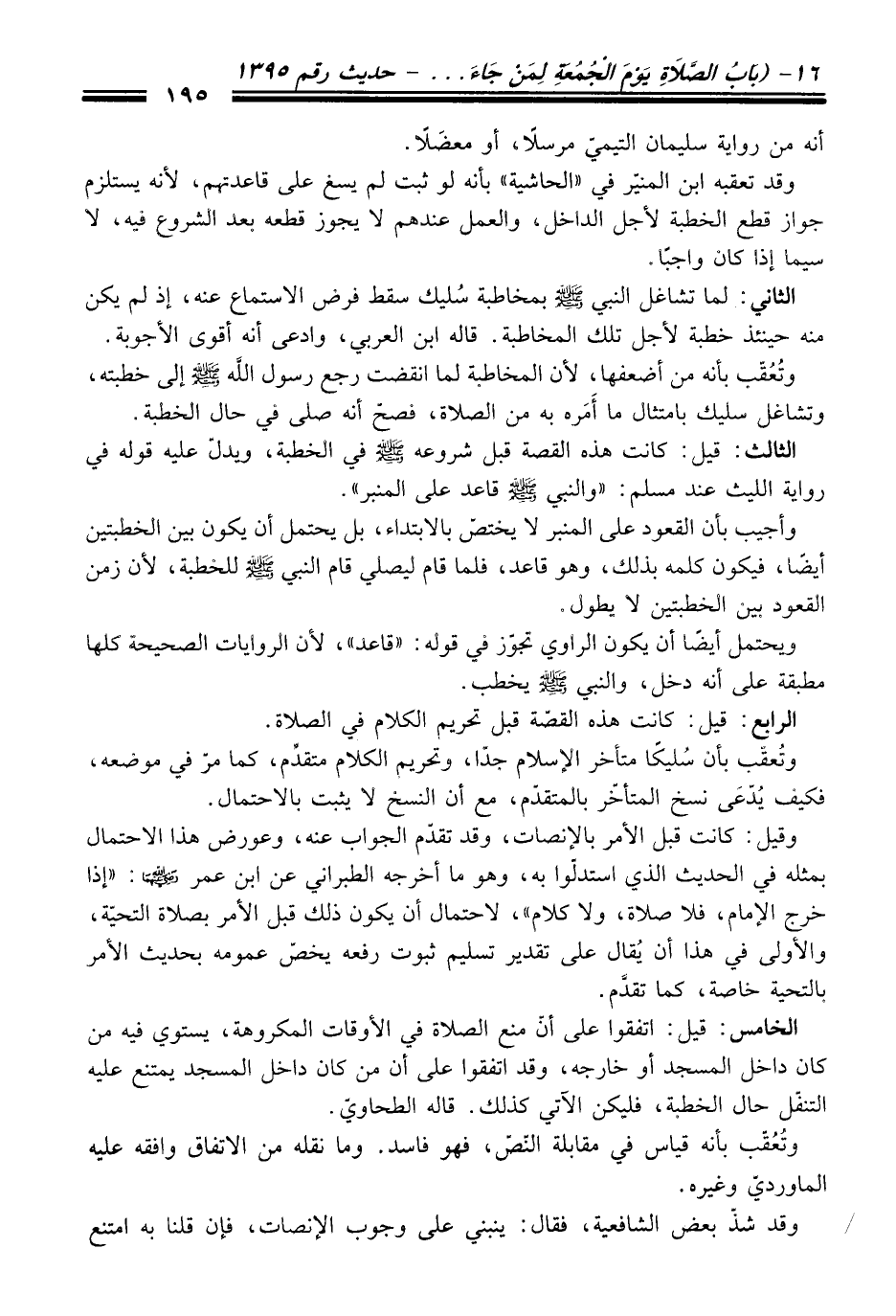 وقيل: كانت قبل الأمر بالإنصات، وقد تقدّم الجواب عنه، وعورض هذا الاحتمال بمثله في الحديث الذي استدلّوا به، وهو ما أخرجه الطبراني عن ابن عمر -رضي الله عنها-: "إذا خرج الإمام، فلا صلاة، ولا كلام"، لاحتمال أن يكون ذلك قبل الأمر بصلاة التحيّة، والأولى في هذا أن يُقال على تقدير تسليم ثبوت رفعه يخصّ عمومه بحديث الأمر بالتحية خاصة، كما تقدَّم.