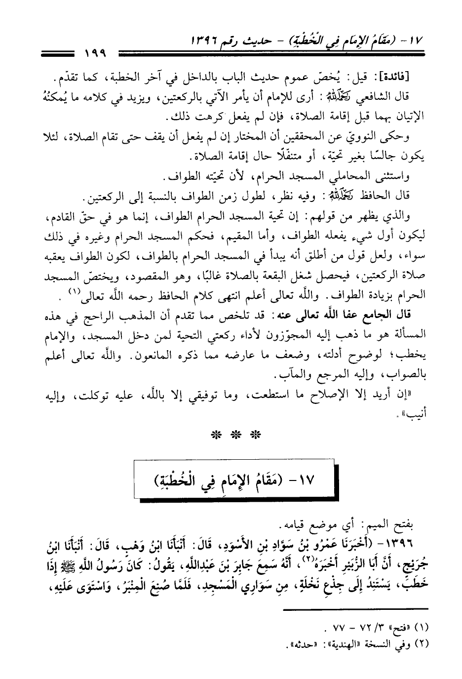 قال الجامع عفا الله تعالى عنه: قد تلخص مما تقدم أن المذهب الراحج في هذه المسألة هو ما ذهب إليه المجوّزون لأداء ركعتي التحية لمن دخل المسجد, والإمام يخطب؛ لوضوح أدلته، وضعف ما عارضه مما ذكره المانعون. والله تعالى أعلم بالصواب، وإليه المرجع والمآب.