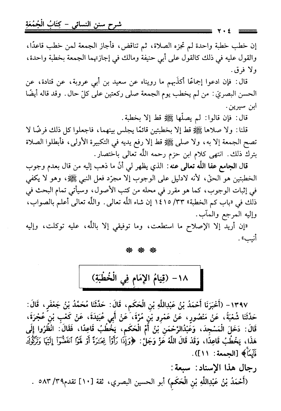 قال: فإن ادعوا إجماعاً أكذَبهم ما رويناه عن سعيد بن أبي عروبة، عن قتادة، عن الحسن البصريّ: من لم يخطب يوم الجمعة صلى ركعتين على كلّ حال. وقد قاله أيضاً ابن سيرين.