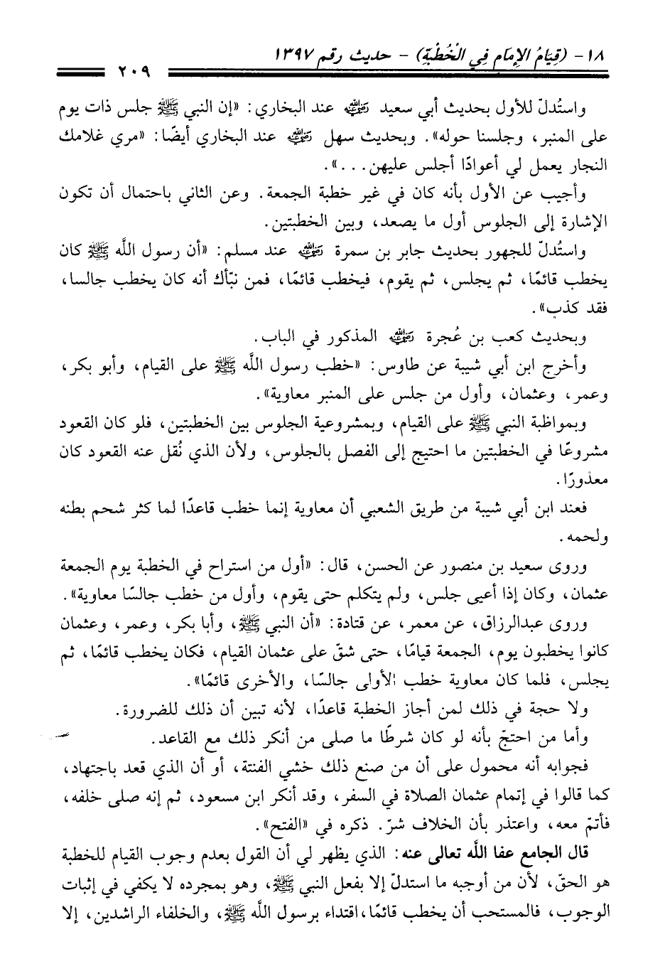 قال الجامع عفا الله تعالى عنه: الذي يظهر لي أن القول بعدم وجوب القيام للخطبة هو الحقّ, لأن من أوجبه ما استدلّ إلا بفعل النبي -صلى الله عليه وسلم-، وهو بمجرده لا يكفي في إثبات الوجوب، فالمستحب أن يخطب قائماً، اقتداء برسول الله -صلى الله عليه وسلم-، والخلفاء الراشدين، إلا
