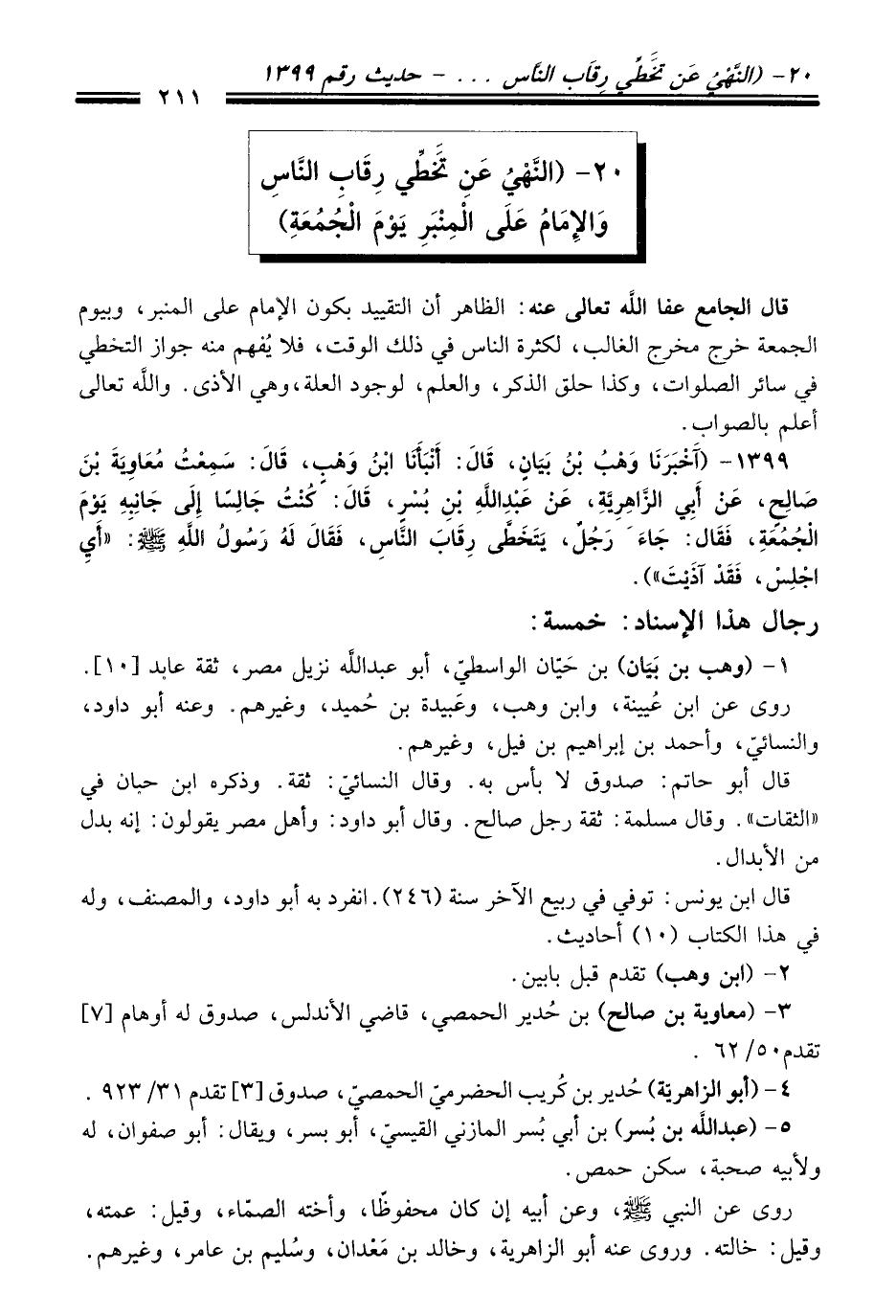 1399 - (أَخْبَرَنَا وَهْبُ بْنُ بَيَانٍ، قَالَ: أَنْبَأَنَا ابْنُ وَهْبٍ، قَالَ: سَمِعْتُ مُعَاوِيَةَ بْنَ صَالِحٍ، عَنْ أَبِي الزَّاهِرِيَّةِ، عَنْ عَبْدِ اللَّهِ بْنِ بُسْرٍ، قَالَ: كُنْتُ جَالِسًا إِلَى جَانِبِهِ يَوْمَ الْجُمُعَةِ، فَقَالَ: جَاءَ رَجُلٌ، يَتَخَطَّى رِقَابَ النَّاسِ، فَقَالَ لَهُ رَسُولُ اللَّهِ -صلى الله عليه وسلم-: "أَيِ اجْلِسْ، فَقَدْ آذَيْتَ").