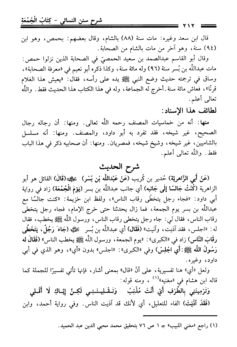 (عَنْ أَبِي الزَّاهِرِيَّةِ) حُدير بن كُريب (عَنْ عَبْد الله بن بُسْر) -رضي الله عنهما- (قَالَ) القائل هو أبو الزاهرية (كُنْتُ جَالساً إلَى جَانبه) أي جانب عبد الله بن بسر (يَوْمَ الْجُمُعَة) زاد في رواية أبي داود: "فجاء وجل يتخطّى رقاب الناس"، ولفظ ابن خزيمة: "كنت جالساً مع عبد الله بن بسر يوم الجمعة، فما زال يحدثنا حتى خرج الإِمام، فجاء رجل يتخطى رقاب الناس، فقال لي: جاء رجل يتخطى رقاب الناس، ورسول الله -صلى الله عليه وسلم- يخطب، فقال له: "اجلس، فقد آذيت، وآنيت" (فَقَال) أي عبد الله بن بُسر -رضي الله عنه- (جَاء رَجُلٌ، يَتَخَطَّى رقَابَ النَّاس) زاد في "الكبرى": "يوم الجمعة، ورسول الله -صلى الله عليه وسلم- يخطب الناس" (فَقَالَ له رَسُولُ الله -صلى الله عليه وسلم-: أَي اجْلِسْ) وفي "الكبرى": "اجلس" بدون "أي"، وهو الذي في أبي داود، وغيره.