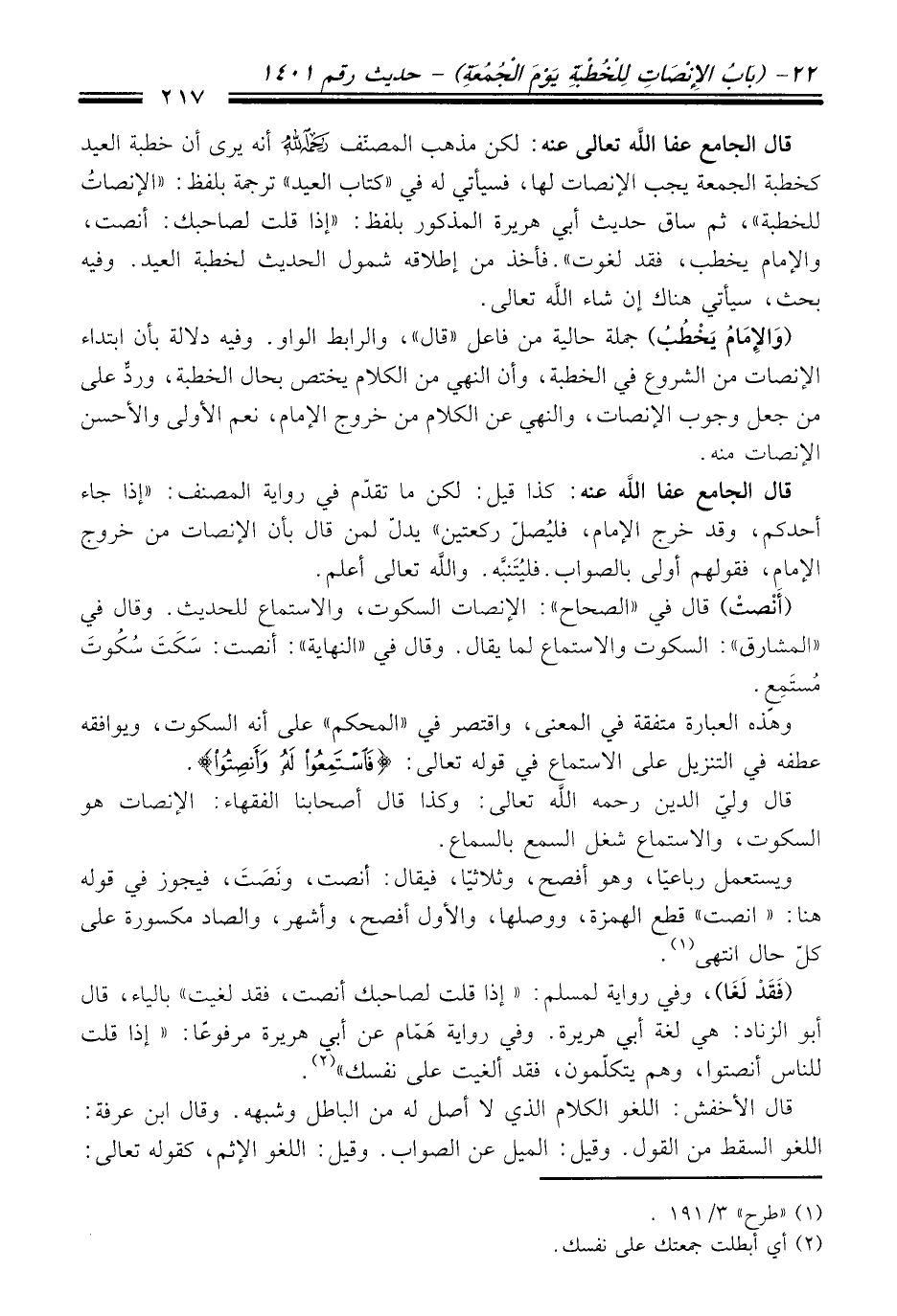 قال الجامع عما الله تعالى عنه: لكن مذهب المصنّف رحمه الله أنه يرى أن خطبة العيد كخطبة الجمعة يجب الإنصاف لها، فسيأتي له في "كتاب العيد" ترجمة بلفظ: "الإنصاتُ للخطبة"، ثم ساق حديث أبي هريرة المذكور بلفظ: "إذا قلت لصاحبك: أنصت، والإمام يخطب، فقد لغوت". فأخذ من إطلاقه شمول الحديث لخطبة العيد. وفيه بحث، سيأتي هناك إن شاء الله تعالى.