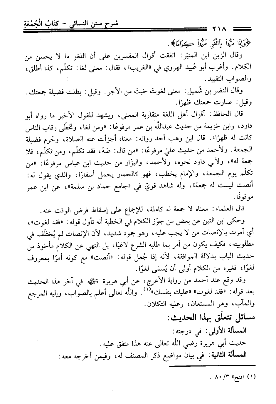 قال الحافظ: أقوال أهل اللغة متقاربة المعنى، ويشهد للقول الأخير ما رواه أبو داود, وابن خزيمة من حديث عبد الله بن عمر مرفوعاً: "ومن لغا، وتخطّي رقاب الناس كانت له ظهراً". قال ابن وهب أحد رواته: معناه أجزأت عنه الصلاة، وحُرم فضيلة الجمعة. ولأحمد من حديث عليّ مرفوعاً: "من قال: صَهْ، فقد تكلم، ومن تكلّم، فلا جمعة له"، ولأبي داود نحوه، ولأحمد، والبزّار من حديث ابن عباس مرفوعاً: "من تكلّم يوم الجمعة، والإمام يخطب، فهو كالحمار يحمل أسفاراً، والذي يقول له: أنصت ليست له جمعة"، وله شاهد قويّ في "جامع حماد بن سلمة"، عن ابن عمر موقوفاً.