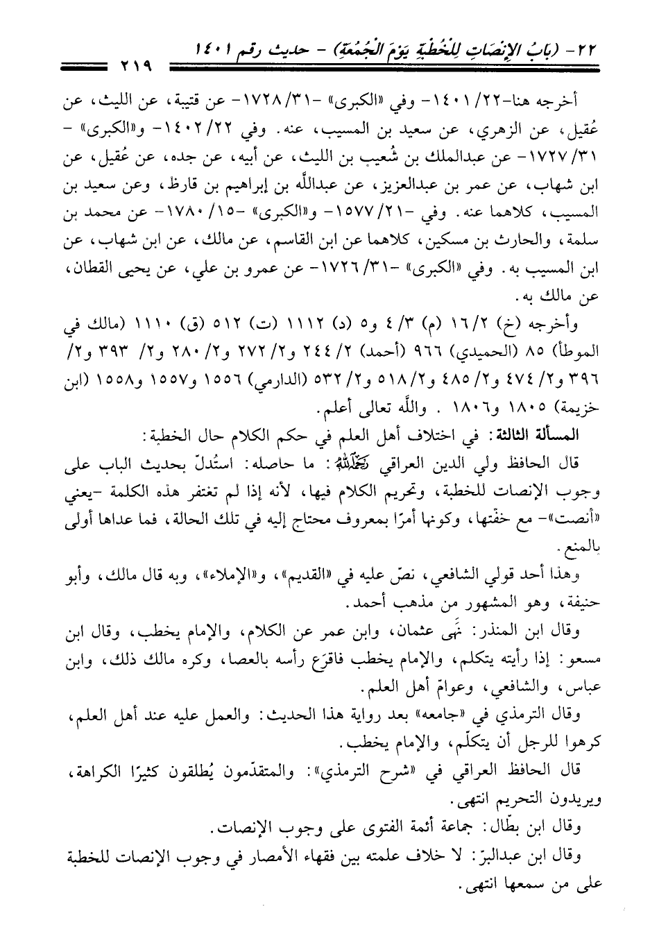 وقال الترمذي في "جامعه" بعد رواية هذا الحديث: والعمل عليه عند أهل العلم، كرهوا للرجل أن يتكلّم، والإمام يخطب.