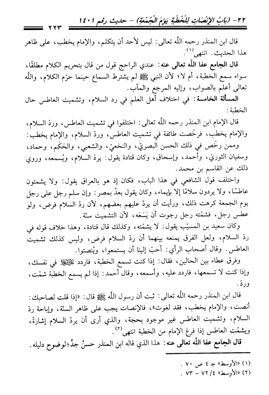 قال ابن المنذر رحمه الله تعالى: ثبت أن رسول الله -صلى الله عليه وسلم- قال: "إذا قلت لصاحبك: أنصت، والإمام يخطب، فقد لغوت"، فالإنصات يجب على ظاهر السنّة، وإباحة ردّ السلام، وتشميت العاطس غير موجود بحجة، والذي أرى أن يردّ السلام إشارةً، ويشمّت العاطس إذا فرغ الإِمام من الخطبة انتهى (¬2).