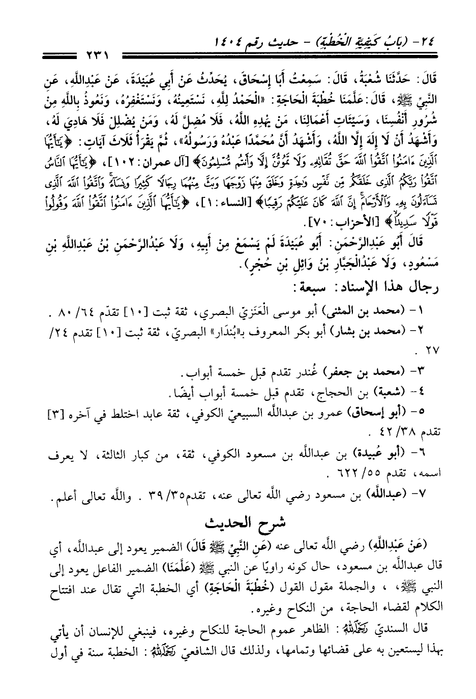 قَالَ: حَدَّثَنَا شُعْبَةُ، قَالَ: سَمِعْتُ أَبَا إِسْحَاقَ، يُحَدِّثُ عَنْ أَبِي عُبَيْدَةَ، عَنْ عَبْدِ اللَّهِ، عَنِ النَّبِيِّ -صلى الله عليه وسلم-، قَالَ: "عَلَّمَنَا خُطْبَةَ الْحَاجَةِ: "الْحَمْدُ لِلَّهِ، نَسْتَعِينُهُ، وَنَسْتَغْفِرُهُ، وَنَعُوذُ بِاللَّهِ مِنْ شُرُورِ أَنْفُسِنَا، وَسَيِّئَاتِ أَعْمَالِنَا، مَنْ يَهْدِهِ اللَّهُ، فَلاَ مُضِلَّ لَهُ، وَمَنْ يُضْلِلْ فَلاَ هَادِىَ لَهُ، وَأَشْهَدُ أَنْ لاَ إِلَهَ إِلاَّ اللَّهُ، وَأَشْهَدُ أَنَّ مُحَمَّدًا عَبْدُهُ وَرَسُولُهُ"، ثُمَّ يَقْرَأُ ثَلاَثَ آيَاتٍ: {يَا أَيُّهَا الَّذِينَ آمَنُوا اتَّقُوا اللَّهَ حَقَّ تُقَاتِهِ وَلاَ تَمُوتُنَّ إِلاَّ وَأَنْتُمْ مُسْلِمُونَ} [آل عمران: 102] {يَا أَيُّهَا النَّاسُ اتَّقُوا رَبَّكُمُ الَّذِي خَلَقَكُمْ مِنْ نَفْسٍ وَاحِدَةٍ وَخَلَقَ مِنْهَا زَوْجَهَا وَبَثَّ مِنْهُمَا رِجَالاً كَثِيرًا وَنِسَاءً وَاتَّقُوا اللَّهَ الَّذِي تَسَاءَلُونَ بِهِ وَالأَرْحَامَ إِنَّ اللَّهَ كَانَ عَلَيْكُمْ رَقِيبًا} [النساء: 1] {يَا أَيُّهَا الَّذِينَ آمَنُوا اتَّقُوا اللَّهَ وَقُولُوا قَوْلاً سَدِيدًا} [الأحزاب: 70].
