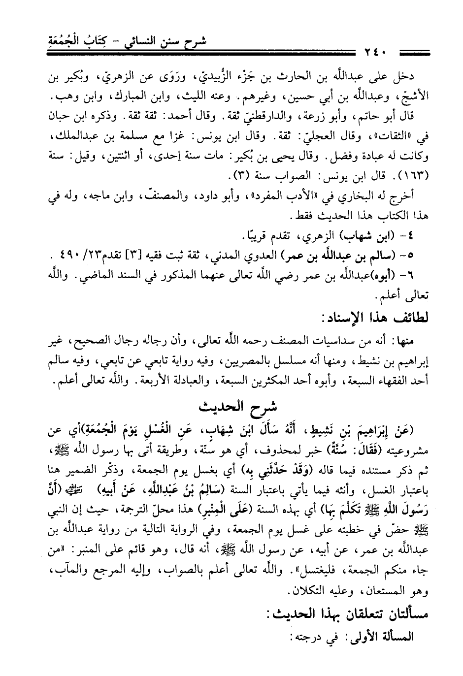 (عَنْ إِبْرَاهِيمَ بْنِ نَشِيطٍ، أَنَّهُ سَأَلَ ابْنَ شِهَابٍ، عَنِ الْغُسْلِ يَوْمَ الْجُمُعَةِ) أي عن مشروعيته (فَقَالَ: سُنَّةٌ) خبر لمحذوف، أي هو سنّة، وطريقة أتى بها رسول الله -صلى الله عليه وسلم-، ثم ذكر مستنده فيما قاله (وَقَدْ حَدَّثَنِي بِه) أي بغسل يوم الجمعة، وذكّر الضمير هنا باعتبار الغسل، وأنثه فيما يأتي باعتبار السنة (سَالِمُ بْنُ عَبْدِ اللهِ، عَنْ أَبيهِ) -رضي الله عنه- (أَنَّ رَسُولَ الله -صلى الله عليه وسلم- تَكَلَّمَ بِهَا) أي بهذه السنة (عَلى الْمِنبرِ) هذا محلّ الترجمة، حيث إن النبي -صلى الله عليه وسلم- حضّ في خطبته على غسل يوم الجمعة، وفي الرواية التالية من رواية عبد الله بن عبد الله بن عمر، عن أبيه، عن رسول الله -صلى الله عليه وسلم-، أنه قال، وهو قائم على المنبر: "من جاء منكم الجمعة، فليغتسل". والله تعالى أعلم بالصواب، وإليه المرجع والمآب، وهو المستعان، وعليه التكلان.