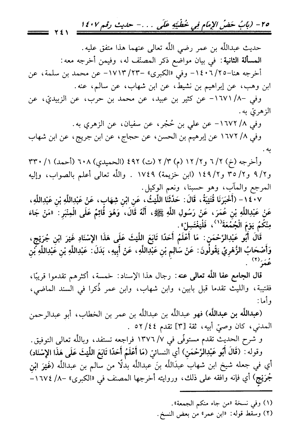 1407 - (أَخْبَرَنَا قُتَيْبَةُ، قَالَ: حَدَّثَنَا اللَّيْثُ، عَنِ ابْنِ شِهَابٍ، عَنْ عَبْدِ اللَّهِ بْنِ عَبْدِ اللَّهِ، عَنْ عَبْدِ اللَّهِ بْنِ عُمَرَ، عَنْ رَسُولِ اللَّهِ -صلى الله عليه وسلم-، أَنَّهُ قَالَ، وَهُوَ قَائِمٌ عَلَى الْمِنْبَرِ: "مَنْ جَاءَ مِنْكُمُ يَوْمَ الْجُمُعَةَ (¬1)، فَلْيَغْتَسِلْ".