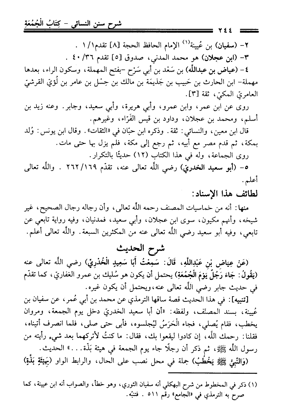 (¬1) ذكر في المخطوط من شرح البهكلي أنه سفيان الثوري، وهو خطأ، والصواب أنه ابن عيينة، كما صرح به الترمذي في "الجامع" رقم 511. فتنبّه.