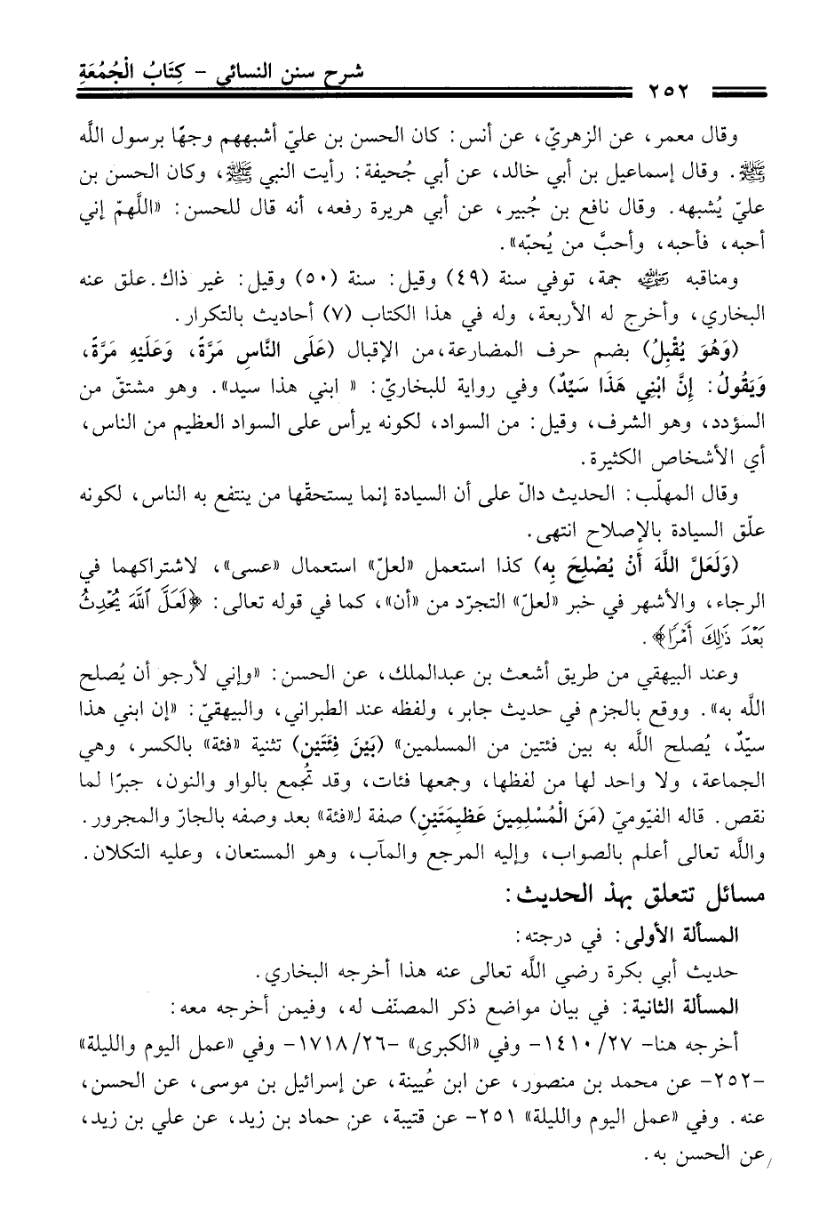 (وَهُوَ يُقْبِلُ) بضم حرف المضارعة، من الإقبال (عَلَى النَّاسِ مَرَّةً، وَعَلَيهِ مَرَّةً، وَيَقُولُ: إِنَّ ابْنِي هَذَا سَيِّدٌ) وفي رواية للبخاريّ: "ابني هذا سيد". وهو مشتقّ من السؤدد، وهو الشرف، وقيل: من السواد، لكونه يرأس على السواد العظيم من الناس، أي الأشخاص الكثيرة.