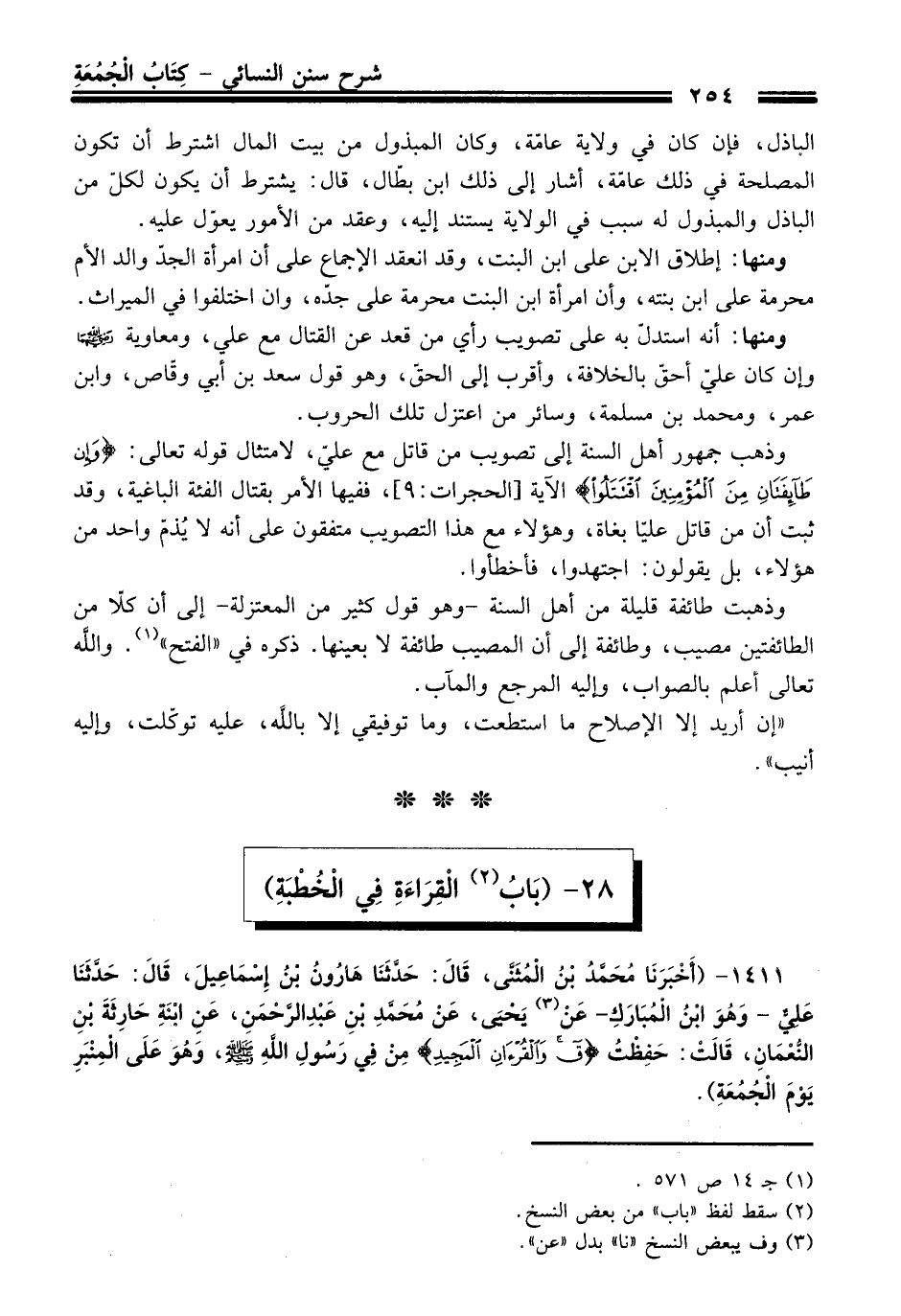 1411 - (أَخْبَرَنَا مُحَمَّدُ بْنُ الْمُثَنَّى، قَالَ: حَدَّثَنَا هَارُونُ بْنُ إِسْمَاعِيلَ، قَالَ: حَدَّثَنَا عَلِيٌّ -وَهُوَ ابْنُ الْمُبَارَكِ- عَنْ (¬3) يَحْيَى، عَنْ مُحَمَّدِ بْنِ عَبْدِ الرَّحْمَنِ، عَنِ ابْنَةِ حَارِثَةَ بْنِ النُّعْمَانِ، قَالَتْ: حَفِظْتُ {ق وَالْقُرْآنِ الْمَجِيدِ} مِنْ فِي رَسُولِ اللَّهِ -صلى الله عليه وسلم- وَهُوَ عَلَى الْمِنْبَرِ يَوْمَ الْجُمُعَةِ).