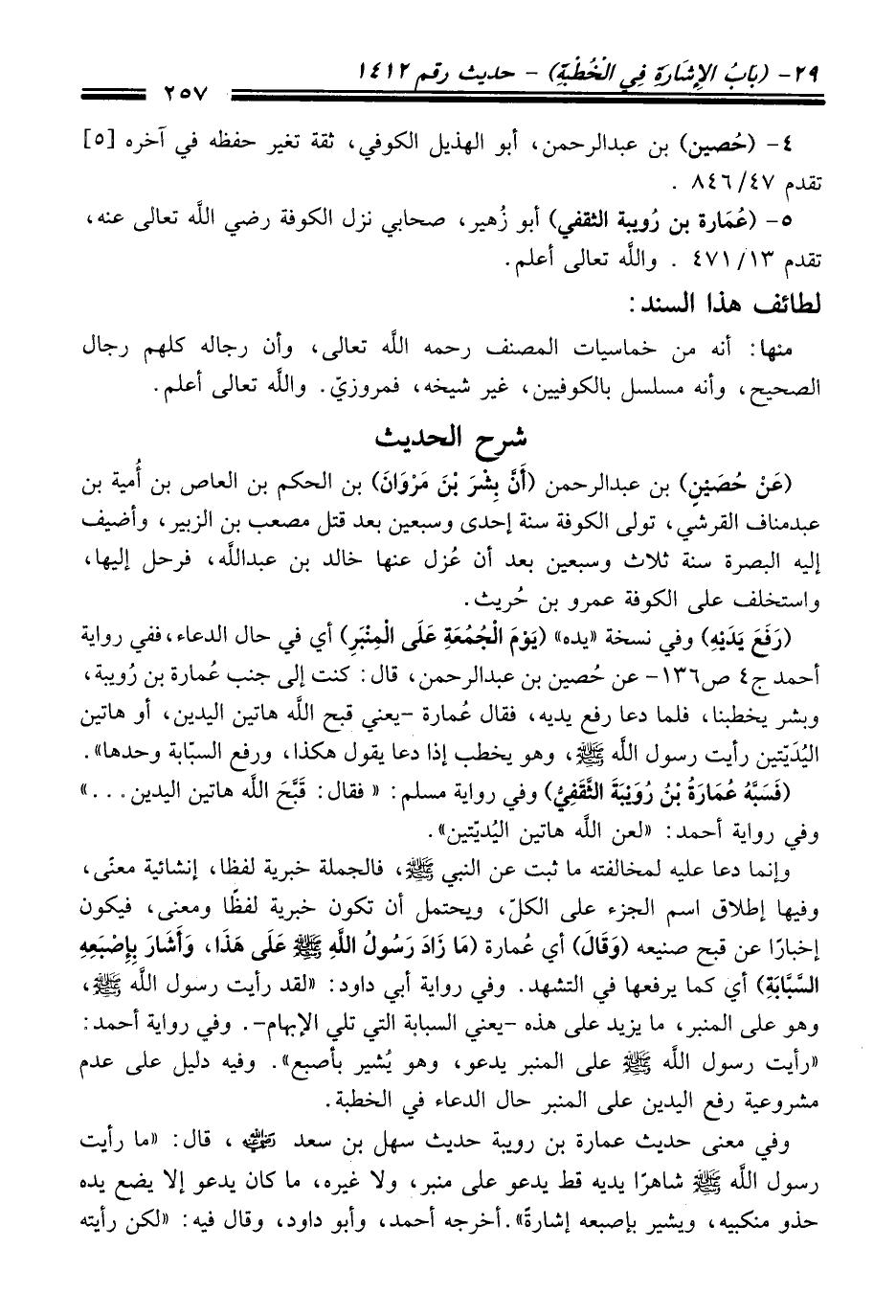 وإنما دعا عليه لمخالفته ما ثبت عن النبي -صلى الله عليه وسلم-، فالجملة خبرية لفظاً، إنشائية معنًى، وفيها إطلاق اسم الجزء على الكلّ، ويحتمل أن تكون خبرية لفظاً ومعنى، فيكون إخباراً عن قبح صنيعه (وَقَالَ) أي عُمارة (مَا زَادَ رَسُولُ اللهِ -صلى الله عليه وسلم- عَلَى هَذَا، وَأَشَارَ بإِصْبَعِهِ السَّبَّابَةِ) أي كما يرفعها في التشهد. وفي رواية أبي داود: "لقد رأيت رسول الله -صلى الله عليه وسلم-، وهو على المنبر، ما يزيد على هذه -يعني السبابة التي تلي الإبهام-. وفي رواية أحمد: "رأيت رسول الله -صلى الله عليه وسلم- على المنبر يدعو، وهو يُشير بأصبع". وفيه دليل على عدم مشروعية رفع اليدين على المنبر حال الدعاء في الخطبة.