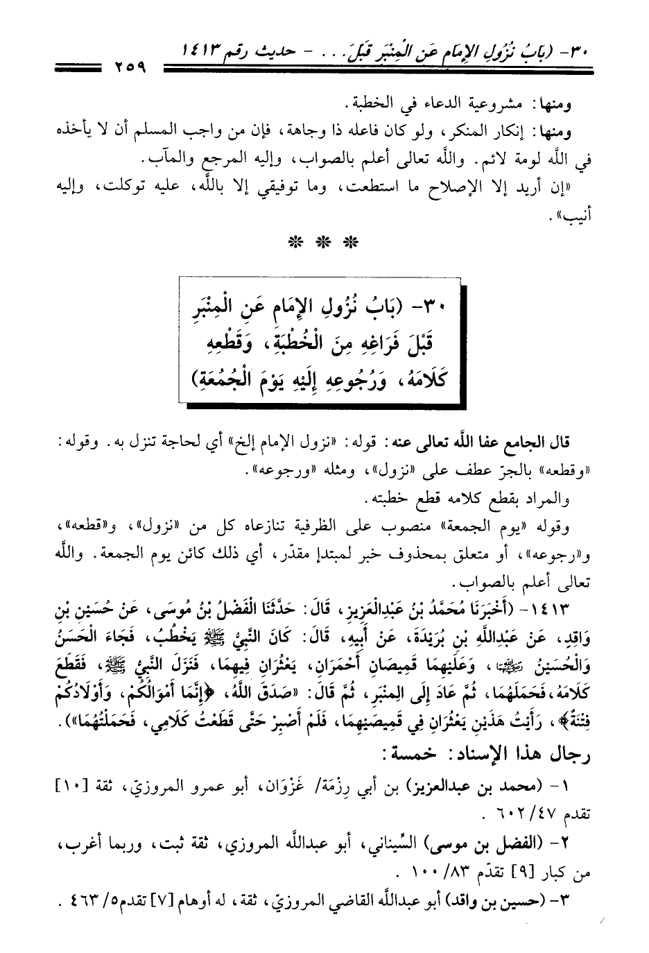 1413 - (أَخْبَرَنَا مُحَمَّدُ بْنُ عَبْدِ الْعَزِيزِ، قَالَ: حَدَّثَنَا الْفَضْلُ بْنُ مُوسَى، عَنْ حُسَيْنِ بْنِ وَاقِدٍ، عَنْ عَبْدِ اللَّهِ بْنِ بُرَيْدَةَ، عَنْ أَبِيهِ، قَالَ: كَانَ النَّبِيُّ -صلى الله عليه وسلم- يَخْطُبُ، فَجَاءَ الْحَسَنُ وَالْحُسَيْنُ -رضي الله عنهما-، وَعَلَيْهِمَا قَمِيصَانِ أَحْمَرَانِ، يَعْثُرَانِ فِيهِمَا، فَنَزَلَ النَّبِيُّ -صلى الله عليه وسلم-، فَقَطَعَ كَلاَمَهُ، فَحَمَلَهُمَا، ثُمَّ عَادَ إِلَى الْمِنْبَرِ، ثُمَّ قَالَ: "صَدَقَ اللَّهُ، {إِنَّمَا أَمْوَالُكُمْ وَأَوْلاَدُكُمْ فِتْنَةٌ} رَأَيْتُ هَذَيْنِ يَعْثُرَانِ فِي قَمِيصَيْهِمَا، فَلَمْ أَصْبِرْ حَتَّى قَطَعْتُ كَلاَمِي، فَحَمَلْتُهُمَا").