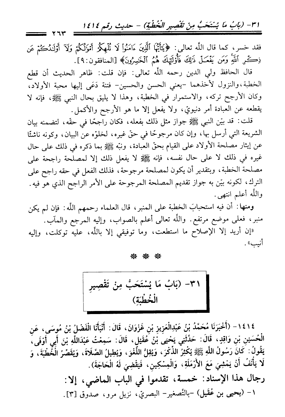 قلت: قد بيّن النبي -صلى الله عليه وسلم- جواز مثل ذلك بفعله، فكان راجحاً في حقه، لتضمنه بيان الشريعة التي أرسل بها، وإن كان مرجوحاً في حقّ غيره، لخلوّه عن البيان، وكونه ناشئاً عن إيثار مصلحة الأولاد على القيام بحقّ العبادة، ونبّه -صلى الله عليه وسلم- بما ذكره في ذلك على حال غيره في ذلك لا على حال نفسه، فإنه -صلى الله عليه وسلم- لا يفعل ذلك إلا لمصلحة راجحة على مصلحة الخطبة، وبتقدير أن يكون لمصلحة مرجوحة، فذلك الفعل في حقه راجح على الترك، لكونه بيّن به جواز تقديم المصلحة المرجوحة على الأمر الراجح الذي هو فيه. والله أعلم انتهى.
