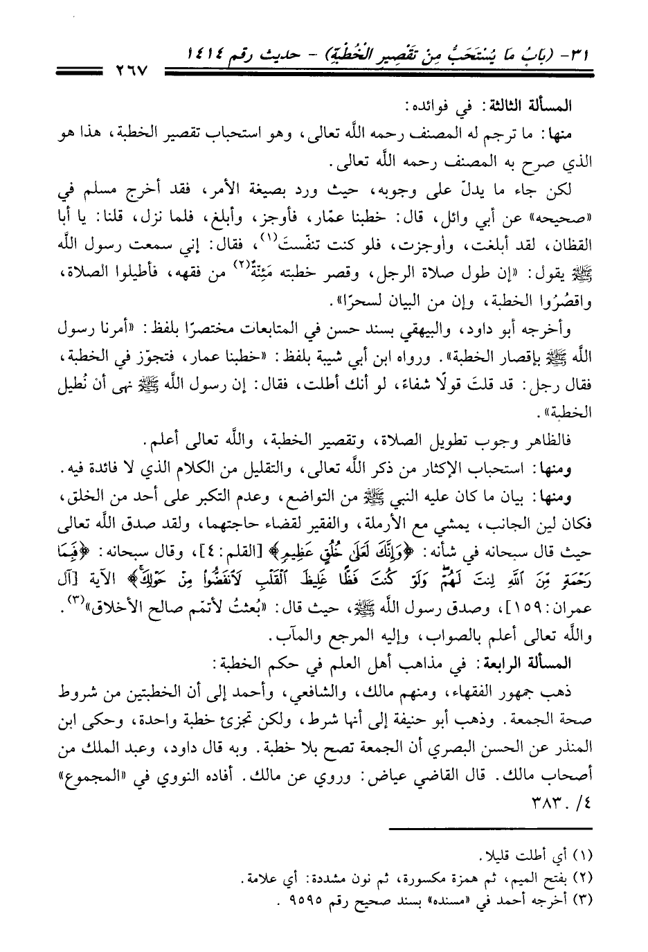 وأخرجه أبو داود، والبيهقي بسند حسن في المتابعات مختصراً بلفظ: "أمرنا رسول الله -صلى الله عليه وسلم- بإقصار الخطبة". ورواه ابن أبي شيبة بلفظ: "خطبنا عمار، فتجوّز في الخطبة، فقال رجل: قد قلتَ قولاً شفاءً، لو أنك أطلت، فقال: إن رسول الله -صلى الله عليه وسلم- نهى أن نُطيل الخطبة".